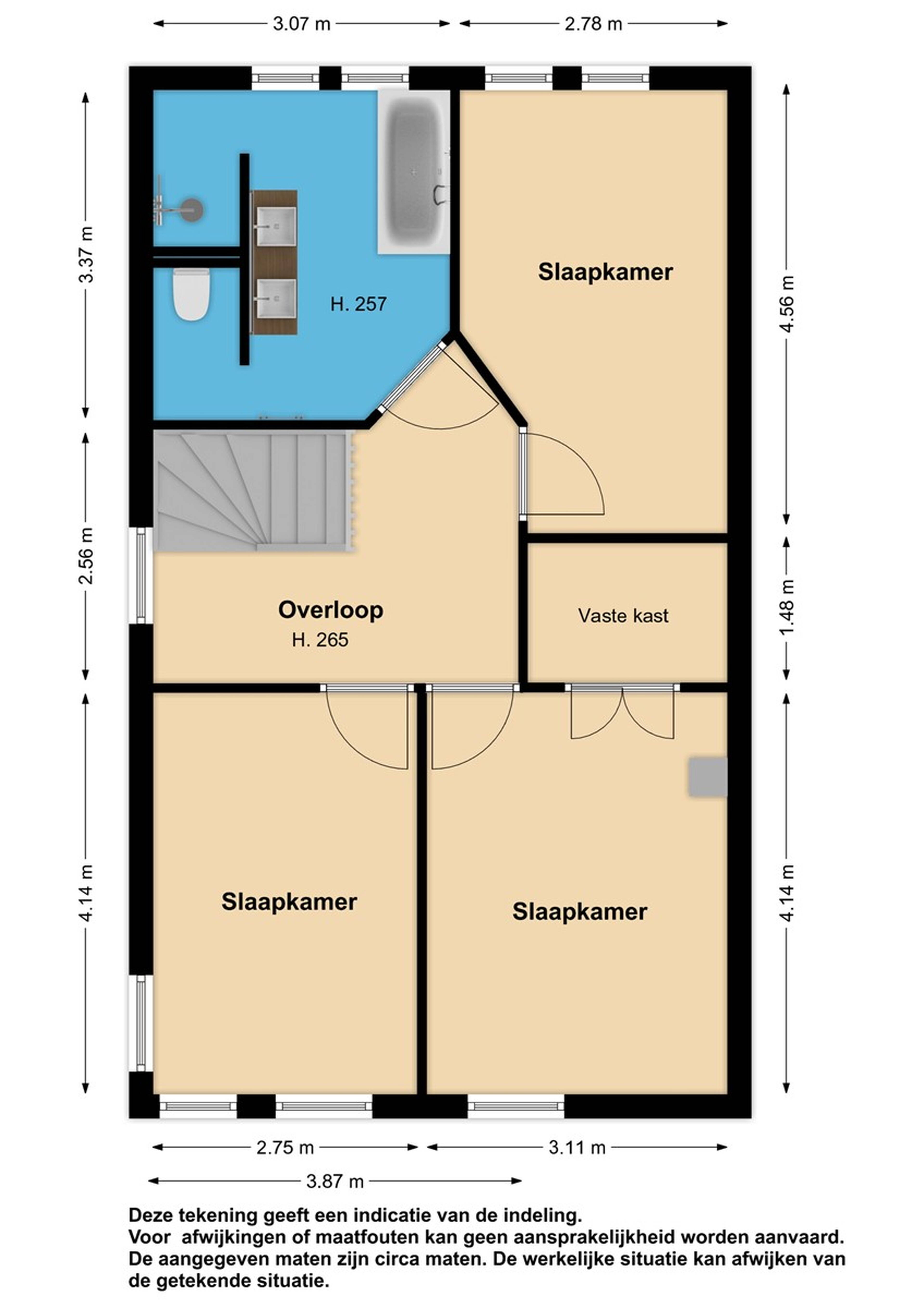 1e verdieping: via een vaste trap komt u op de zeer ruime overloop van de 1e verdieping. Op deze verdieping zijn 3 ruime slaapkamers gesitueerd. In alle slaapkamers kunt u met gemak een 2 persoonsbed plaatsen. De ouderslaapkamer aan de voorzijde is extra voorzien van een diepe inloopkast. Alle slaapkamers zijn keurig afgewerkt en voorzien van laminaatvloeren.
