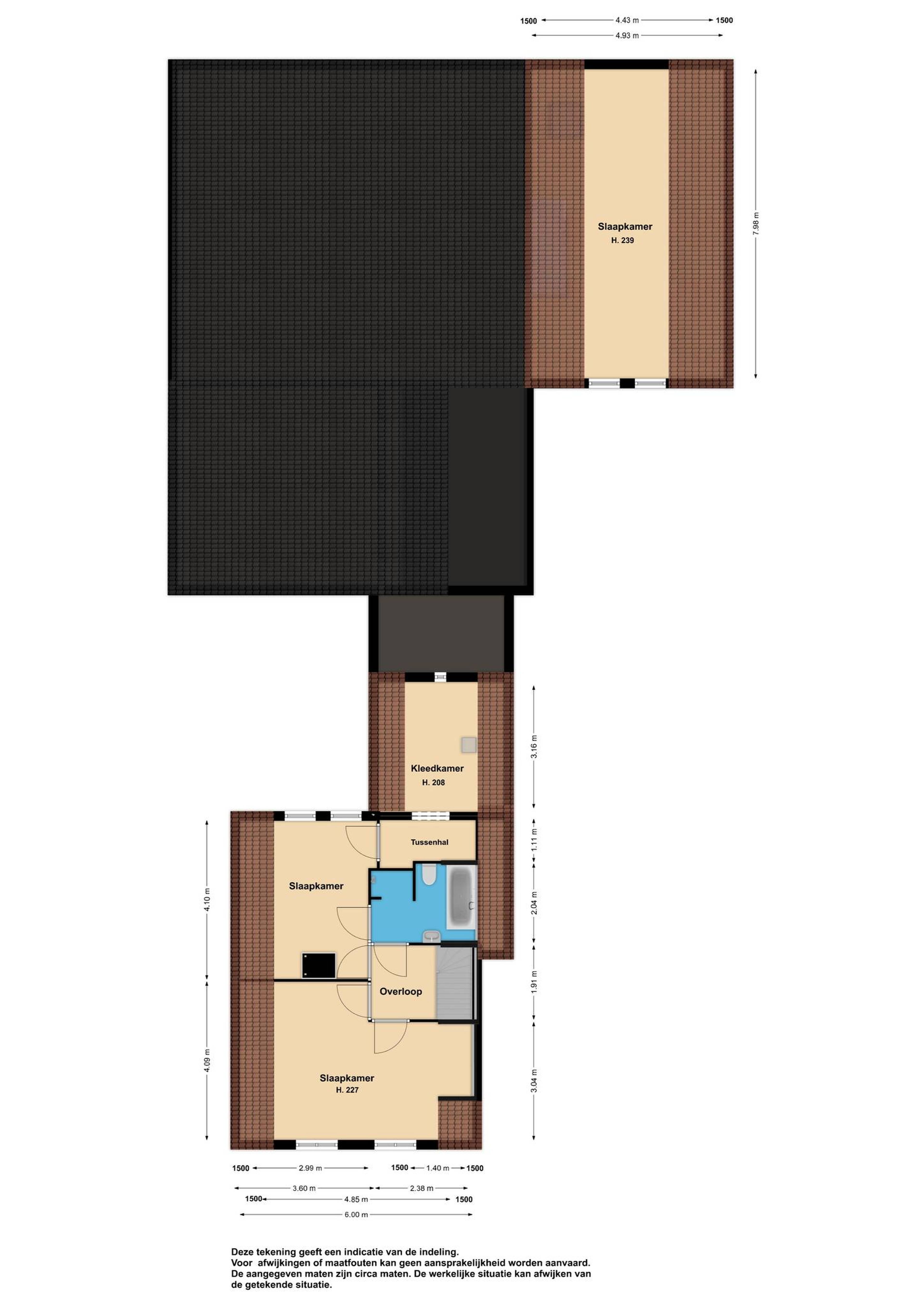 Badkamer: de functionele badkamer met dakkapel is in een lichte kleurstelling uitgevoerd. In de badkamer treft u een inloop-douche, een wastafel, kunststof ligbad en een hangcloset aan.