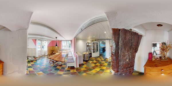 Het voorhuis biedt plaats aan een zeer ruime woonkamer. De living is voorzien van een nieuwe schuimbeton vloer, welke is afgewerkt met fraaie massief Grenen houten vloerdelen. De wanden zijn gestuukt en het balkenplafond is goed in het zicht. Dit geeft deze ruimte een markante uitstraling mee. De houtkachel met schouw versterkt dit rijke gevoel nog eens extra. Wat direct opvalt, is dat deze living heel licht en zonnig is door de vele ramen die hier aanwezig zijn. Bovendien is de ruimte voorzien van een ruime erker met zicht op de geiten en kippen in de zijtuin!