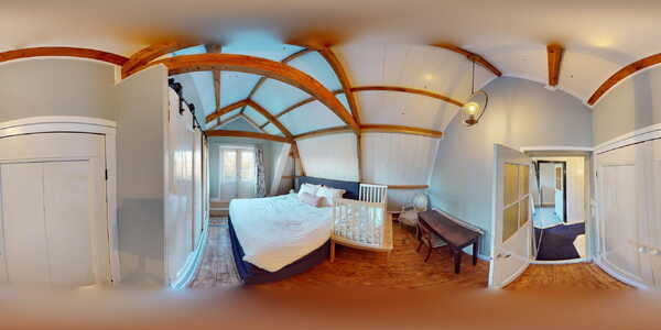 1e verdieping: via de vaste trap in de entreehal bereikt u de 1e verdieping, waar zich 4 flinke slaapkamers bevinden. In alle slaapkamers kunt u prima een 2 persoons bed plaatsen. In de slaapkamer aan de voorzijde treft u naast het hoge plafond ook zelfs een moderne bedstede aan. De 2e slaapkamer in het voorhuis is voorzien van een houten vloer, is eveneens uitgevoerd met een hoog plafond met balken en is bovendien voorzien van een aantal vaste kasten.
