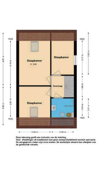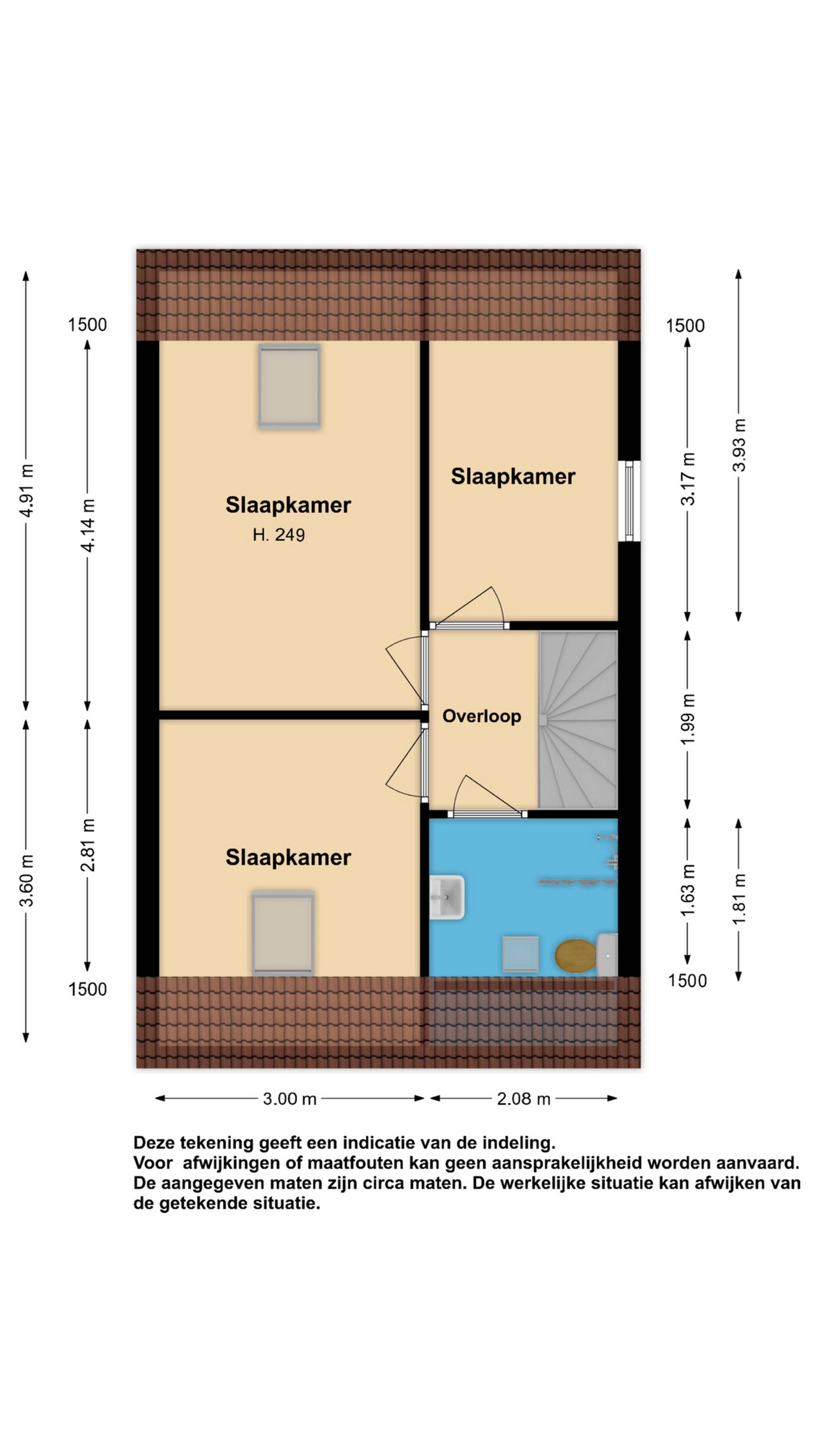 1e verdieping: op de 1e verdieping zijn 3 slaapkamers van verschillende afmetingen aanwezig. In 2 van de 3 slaapkamers kunt u prima een 2-persoonsbed plaatsen. Alle slaapkamers zijn netjes afgewerkt onder meer met laminaatvloeren.