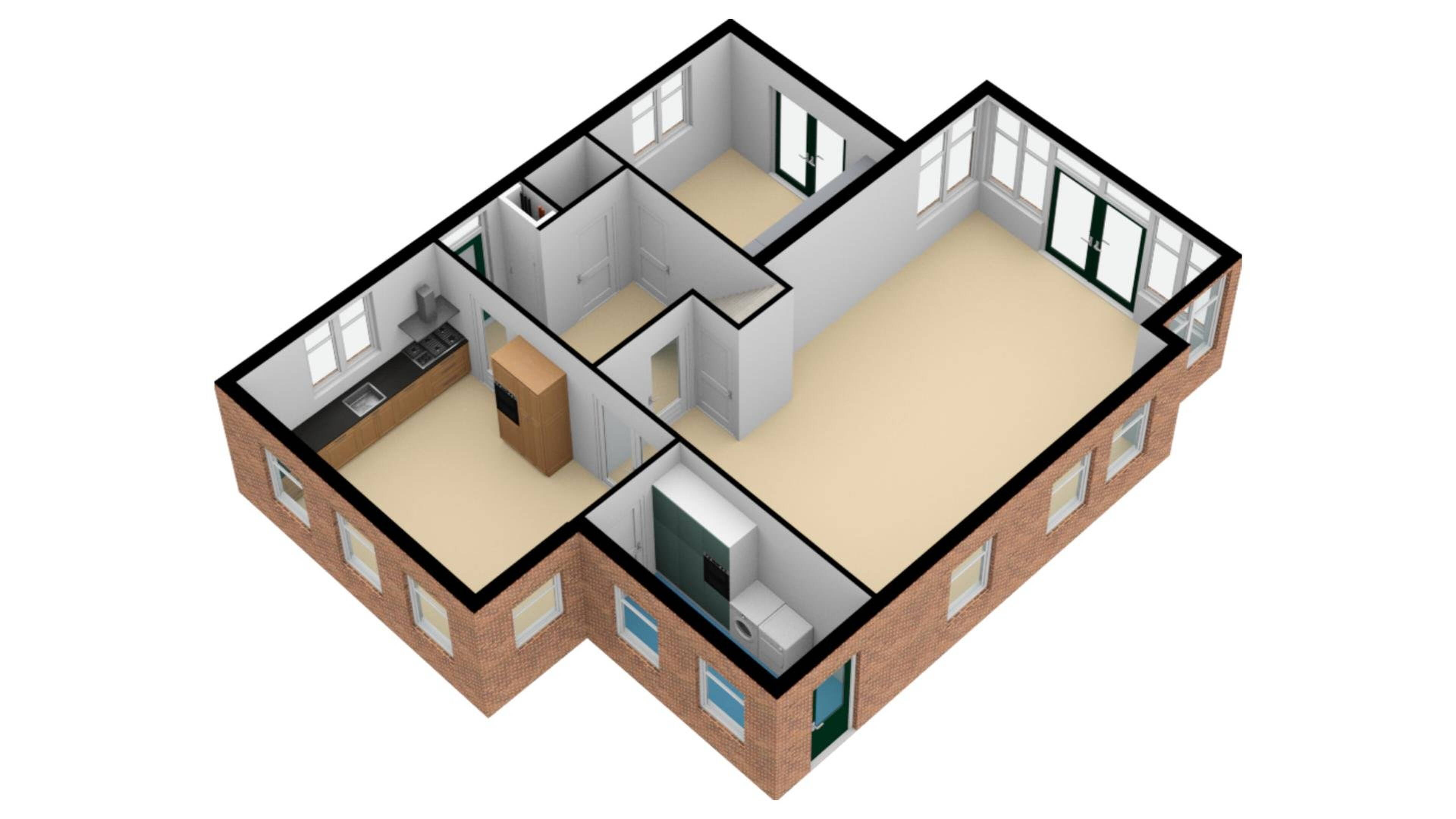 Bijkeuken: in de bijkeuken treft u een extra kastenwand in de stijl van de keuken, waarin zich een vriezer, koelkast en een magnetron bevindt. Bovendien kunt u in de bijkeuken uw wasmachine of droger een plekje geven. De bijkeuken is ook van buitenaf te bereiken, waardoor u dit ook als extra ingang kan gebruiken.