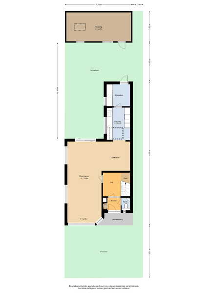 We kunnen de tuin betreden door de zojuist genoemde schuifpui, maar ook via de aan de keuken grenzende bijkeuken, waar momenteel de was- en drooggelegenheid is geplaatst onder een werkblad waar u fluitend de was op kunt vouwen.