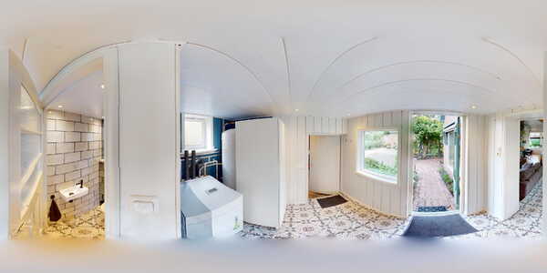 Vanuit de woonkamer is de handige bijkeuken bereikbaar. U heeft hier voldoende ruimte voor het plaatsen van een extra koel/vriescombinatie. U zult de bijkeuken veel gebruiken als toegang naar de woning. Immers “goed volk komt altijd achterom”. In deze bijkeuken heeft u een fraai afgewerkte toiletruimte met hangcloset en fonteintje tot uw beschikking. Het geheel is in de stijl van het gehele huis afgewerkt.