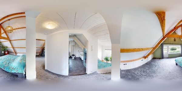 1e verdieping: via de overloop kunt u twee ruime slaapkamers bereiken. De beide slaapkamers zijn fraai ingericht. Heeft u de behoefte aan meer slaapkamers? U kunt vanzelfsprekend op deze verdieping de indeling aanpassen om bijvoorbeeld 3 slaapkamers te creëren. De slaapkamer aan de achterzijde biedt u een enorme ruimte, mede ingegeven door het hoge plafond. De kamer is fraai afgewerkt met de dakspanten in zicht. Bovendien kunt u hier vanuit uw bed eveneens weer genieten van het fraaie uitzicht! Zo wordt u ’s morgens ook heerlijk wakker in dit levende schilderij!