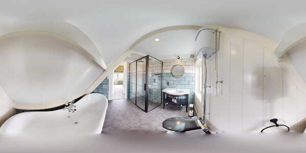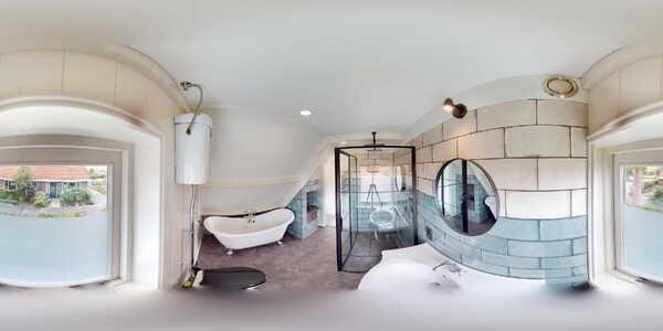 De fraaie badkamer is ook geheel in de modern-classic interieurstijl van het huis uitgevoerd. De badkamer is volledig voorzien van een fraaie betegeling op de wanden en de vloer. Deze badkamer is voorzien van een dubbele douchegelegenheid, een wastafelmeubel en een vrijstaand klassiek ligbad op pootjes. In de badkamer treft u een speciaal toilet met klassieke uitstraling aan.