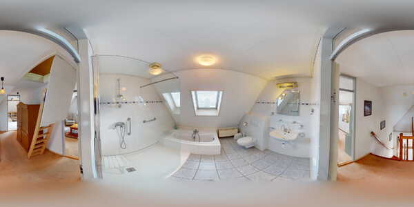 De keurige en ruime badkamer is uitgevoerd in een lichte kleurstelling en voorzien van een inloopdouche, ligbad, wastafel en een hangcloset. De badkamer is volledig betegeld en voorzien van dakraam, waardoor u deze ruimte op een natuurlijke manier kunt ventileren!