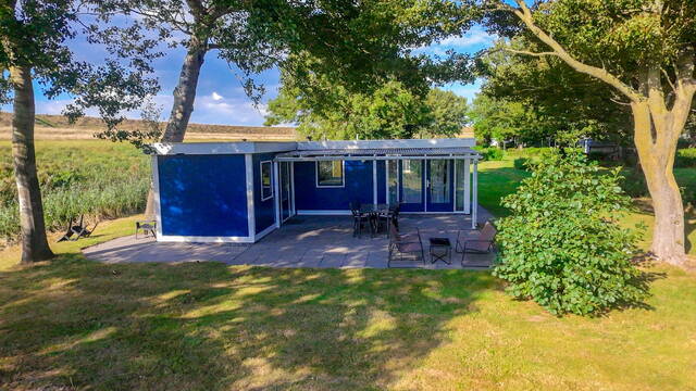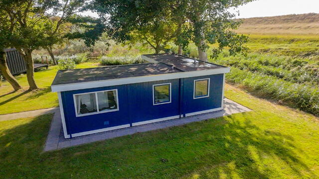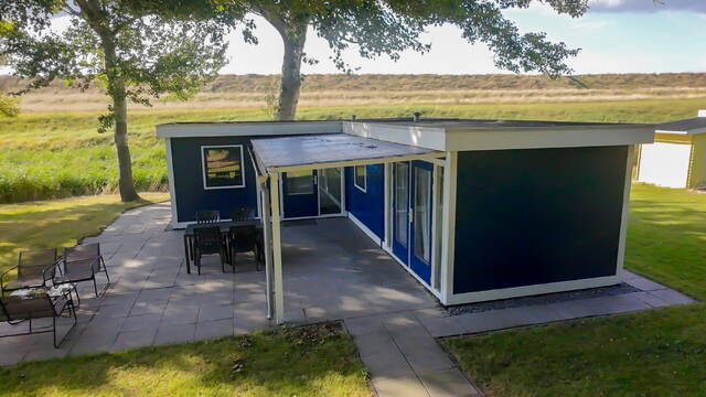 Aan de zijkant bevindt zich over de gehele lengte van het chalet een overkapping boven het betegelde terras, de openslaande deuren en de voordeur. Erg makkelijk als u met volle boodschappentassen tijdens een plotselinge regenbui uw sleutels nog moet zoeken om de voordeur open te maken of een mogelijkheid om toch het wasrek nog even buiten weg te zetten als het onverhoopt gaat regenen.