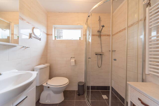 De hal biedt ook toegang tot de bergruimte waar de CV-combiketel nu hangt, maar deze ruimte zou u ook kunnen gebruiken om bijvoorbeeld een wasmachine te plaatsen. De badkamer is prima van formaat en is voorzien van een douche, toilet, badkamer meubel met wasbak. spiegel en planchet en zelfs hier hangt een radiator waar u uw handdoek op kunt drogen na het douchen.