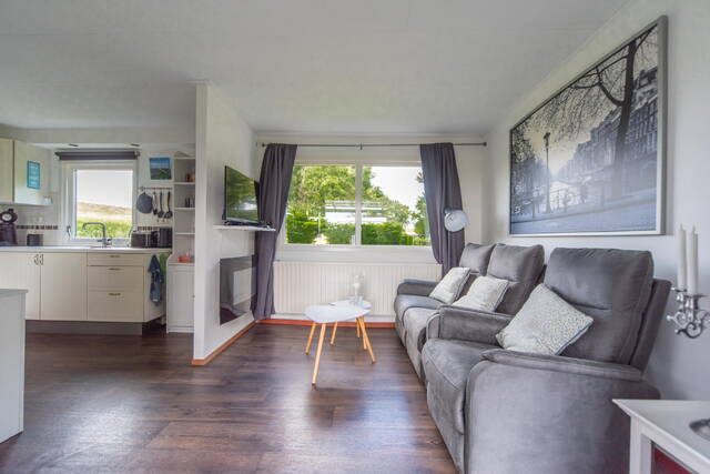 Die derzeitigen Bewohner lassen das Chalet wie gesagt vollständig möbliert zurück – also bleiben auch das kürzlich gekaufte Sofa und der Sessel, beide mit elektrisch eingebauter Fußstütze, sowie der Fernseher und der Zierkamin einfach im Wohnzimmer, das – für ein Chalet – schön groß ist. Das Wohnzimmer hat außerdem zwei Flügeltüren zur überdachten Sonnenterrasse, wo Sie es sich an der Kunststoff-Gartengarnitur gut gehen lassen oder sich auf der vorhandenen Lounge-Garnitur ausstrecken können.