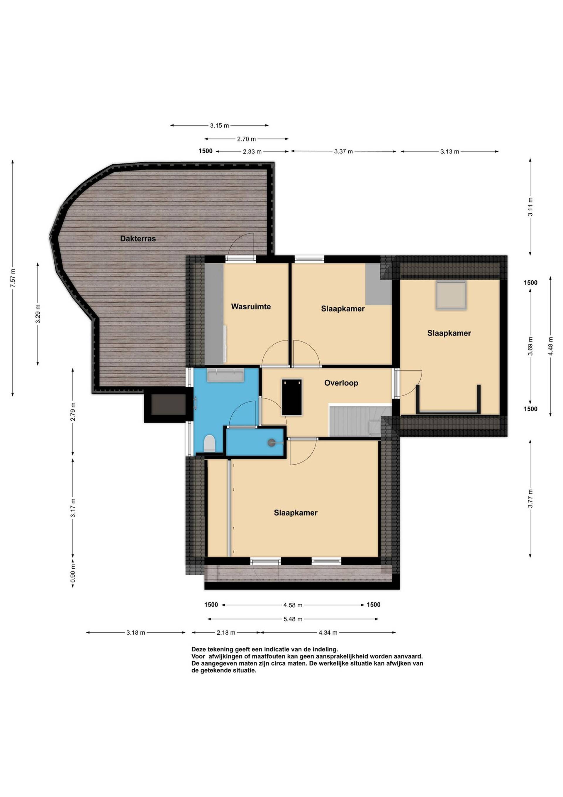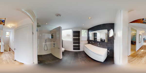 De ruime luxe badkamer is uitgevoerd in een witte kleurstelling met antracietkleurige accenten. De badkamer is voorzien van een dakkapel en heeft een riante inloopdouche met stortdouche, handdouche en drain, een hangcloset en een extra breed wastafelmeubel met dubbele kranen. Uiteraard is deze badkamer ook voorzien van een design-radiator en vloerverwarming.