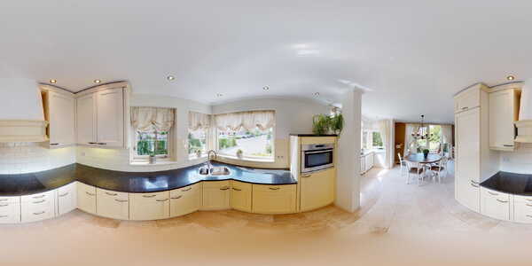 De diverse openslaande tuindeuren en de vele hoge ramen verbinden nog eens extra de tuin met de leefruimte. De living is voorzien van een fraaie natuurstenenvloer met CV-vloerverwarming. De wanden zijn gestuukt en het plafond is glad gestuukt en afgewerkt met plafondsierlijsten. In het zitgedeelte heeft u een prachtige Beauvallon kalksteenschouw met gashaard tot uw beschikking. Komt u maar eens in de living plaatsnemen. En ervaar het zicht naar buiten toe aan de zijkant én aan de achterzijde! Heerlijk open en geen zicht op de direct omwonenden. Vanuit de woonkamer heeft u toegang naar de bijkeuken.