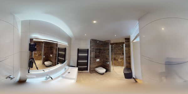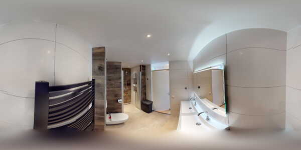 De luxe ruime badkamer in moderne kleurstelling is uitgerust met een inloopdouche met dubbele douche en drain, dubbele wastafel met meubel, hangcloset en designradiator. De badkamer is, ten opzichte van de standaard indeling van dit type woonhuis, extra vergroot!