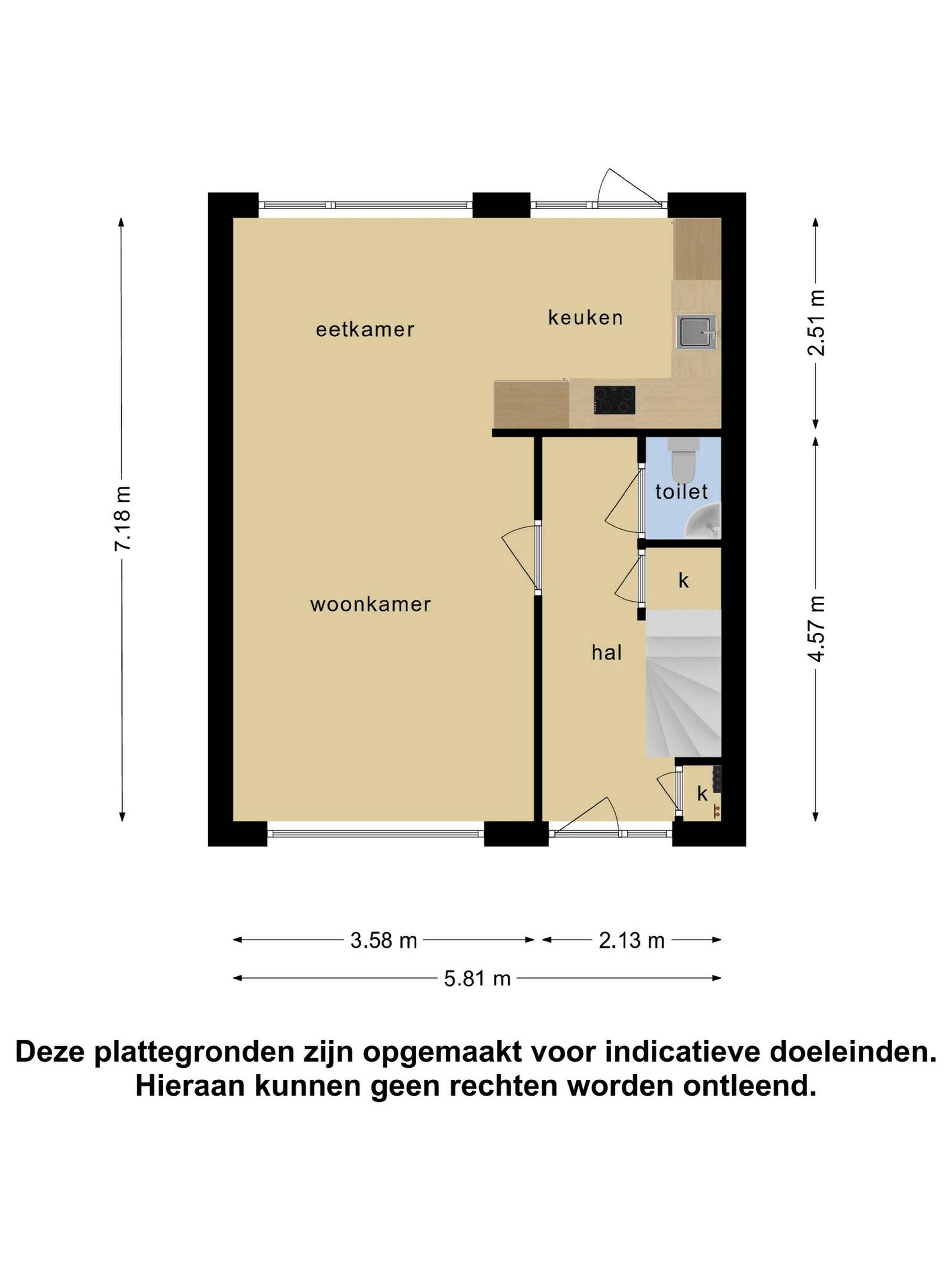 Via de entree komt u in de hal met garderoberuimte, toiletruimte, meterkast, trapkast en de trapopgang naar de verdieping. De aansluiting voor de wasmachine bevindt zich thans in deze trapkast.