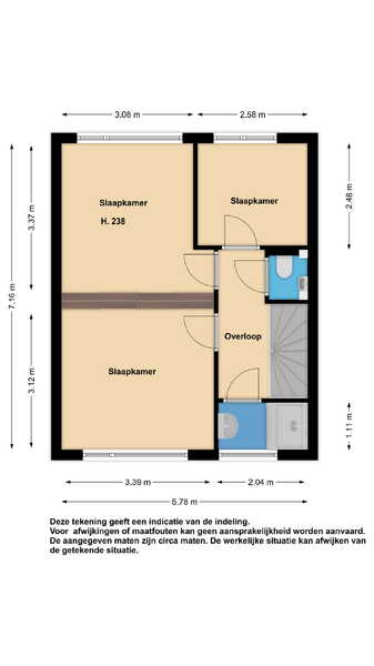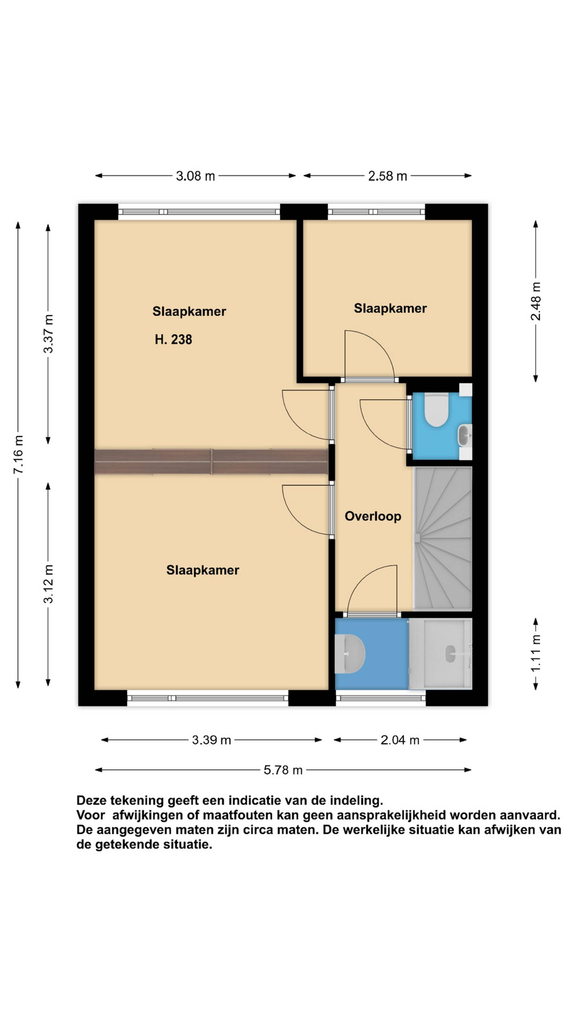 1e verdieping: op de 1e verdieping zijn naast de overloop en badkamer, een 3-tal slaapkamers van verschillende afmetingen gesitueerd. In 2 slaapkamers kunt u met gemak een 2-persoonsbed plaatsen. In de voor- en achterslaapkamer is een vaste kastenwand aanwezig. Door de vormgeving van de woning heeft u de beschikking over recht opgetrokken wanden en hierdoor is er ook op deze verdieping veel ruimte aanwezig. De gehele 1e verdieping is keurig afgewerkt met vloerbedekking. Op de overloop heeft u een separate, recent geïnstalleerde en moderne toiletruimte met hangcloset en fonteintje tot uw beschikking.