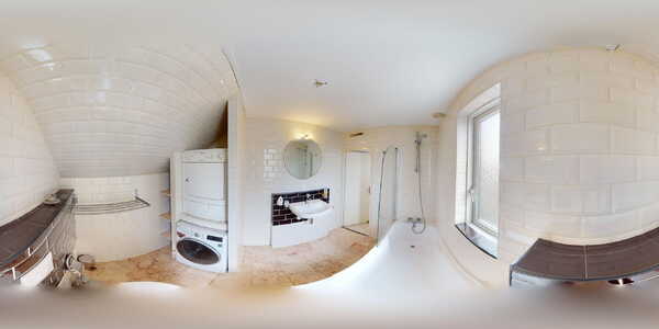 De wanden zijn net als in de keuken met een klassieke metro tegel bekleed en de vloer heeft marmeren plavuizen. De badkamer is uitgerust met een kunststof ligbad met douchegelegenheid, wastafel en hangcloset. In de badkamer heeft u ook de mogelijkheid om uw wasmachine en wasdroger een plaatsje te geven. Door de indeling staan deze niet direct in het zicht!