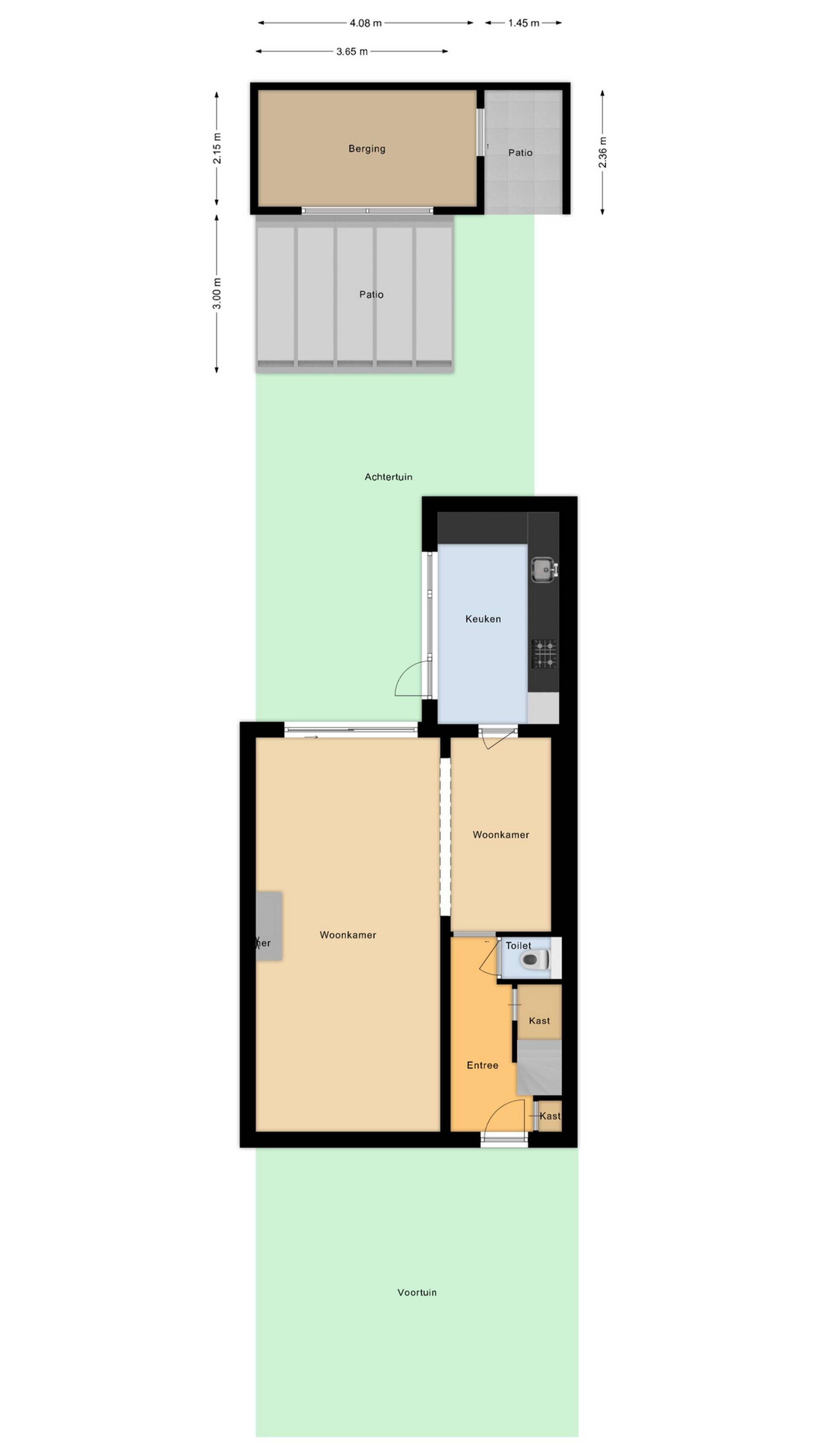Berging: achterin de tuin is een grote stenen berging over nagenoeg de gehele breedte van het perceel, voorzien van elektriciteit. Een uitstekende plek voor het opbergen van fietsen, tuinmeubilair en gereedschap, of om te klussen. Via de handige overkapping naast de berging heeft u toegang tot het achterliggende steegje.