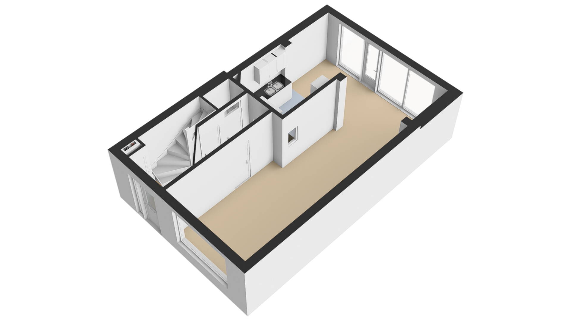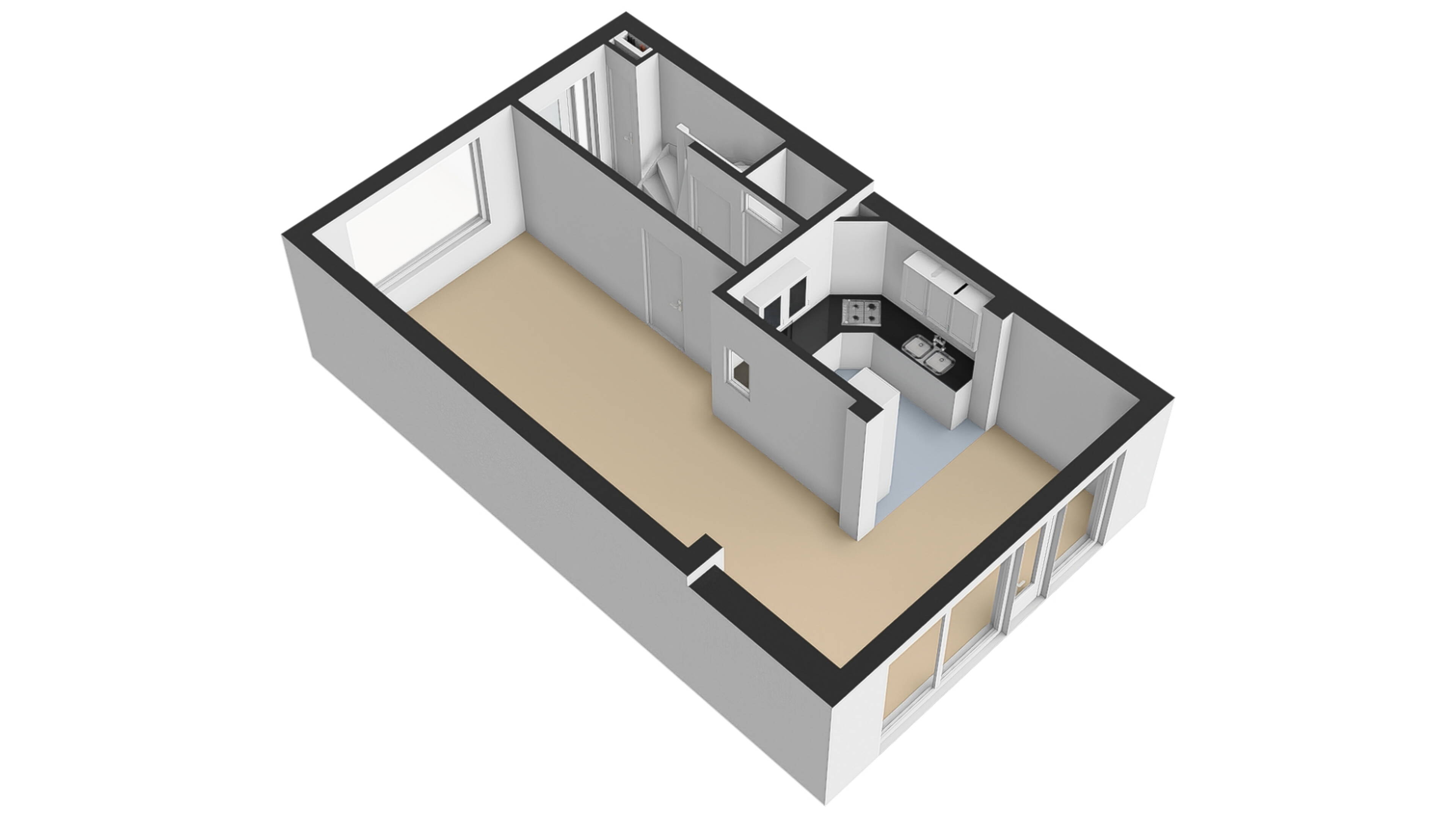 De hoek opgestelde keuken is bereikbaar via de uitbouw aan de achterzijde. Een bijkomend voordeel is dat u vanaf het zitgedeelte geen direct zicht heeft op uw aanrecht. De keuken is in een lichte kleurstelling uitgevoerd met een fraaie zwarte metro tegel op de achterwand. De keuken is uitgerust met een afzuigkap, dubbele spoelbak, 4-pits gaskookplaat en koelkast. In de aanbouw kunt u prima een grote eettafel plaatsen. Via de tuindeur heeft u toegang tot de achtertuin.