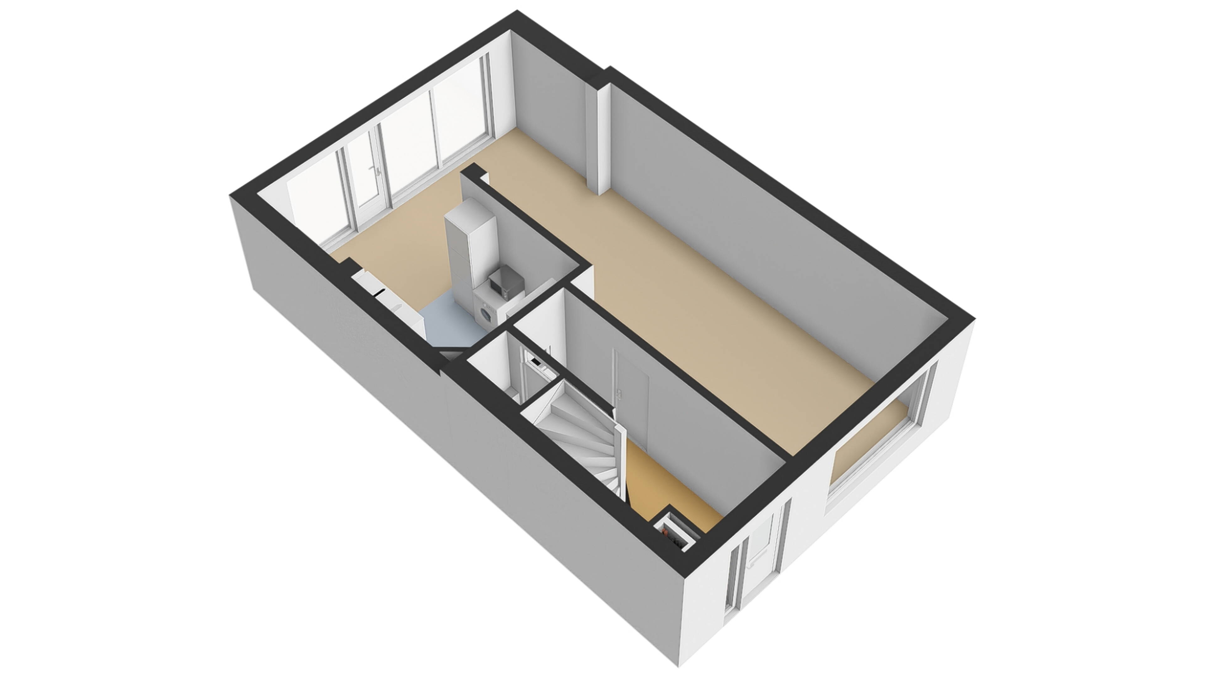 De woonkamer kenmerkt zich door het grote raam aan de voorzijde en grote ramen aan de achterzijde, waardoor de kamer erg licht en zonnig is. Aan de voorzijde bevindt zich het zitgedeelte met zicht op openbaar groen, terwijl het eetgedeelte aan de achterzijde is gesitueerd. De vloer is afgewerkt met een laminaatvloer en het plafond is voorzien van strak stucwerk. Dankzij de praktische vormgeving van de woonkamer, heeft u verschillende opties voor het inrichten van uw interieur. Door de uitbouw aan de achterzijde van de woning heeft u veel leefruimte tot uw beschikking.