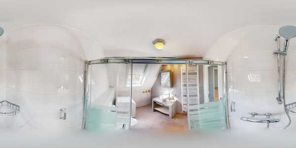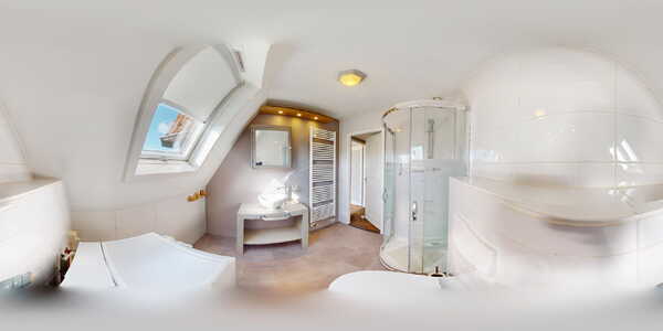 De badkamer uit 2016 is in een moderne grijze kleurstelling uitgevoerd. Uitgerust met een halfronde douchecabine, wastafelmeubel, 2e hangcloset en design-radiator. U heeft voldoende ruimte om, indien gewenst, hier een ligbad te plaatsen.