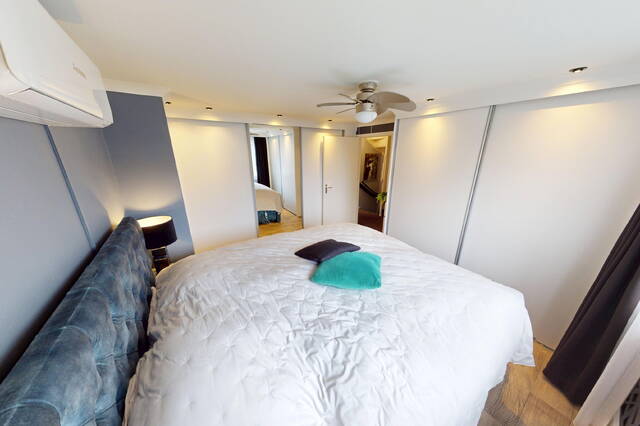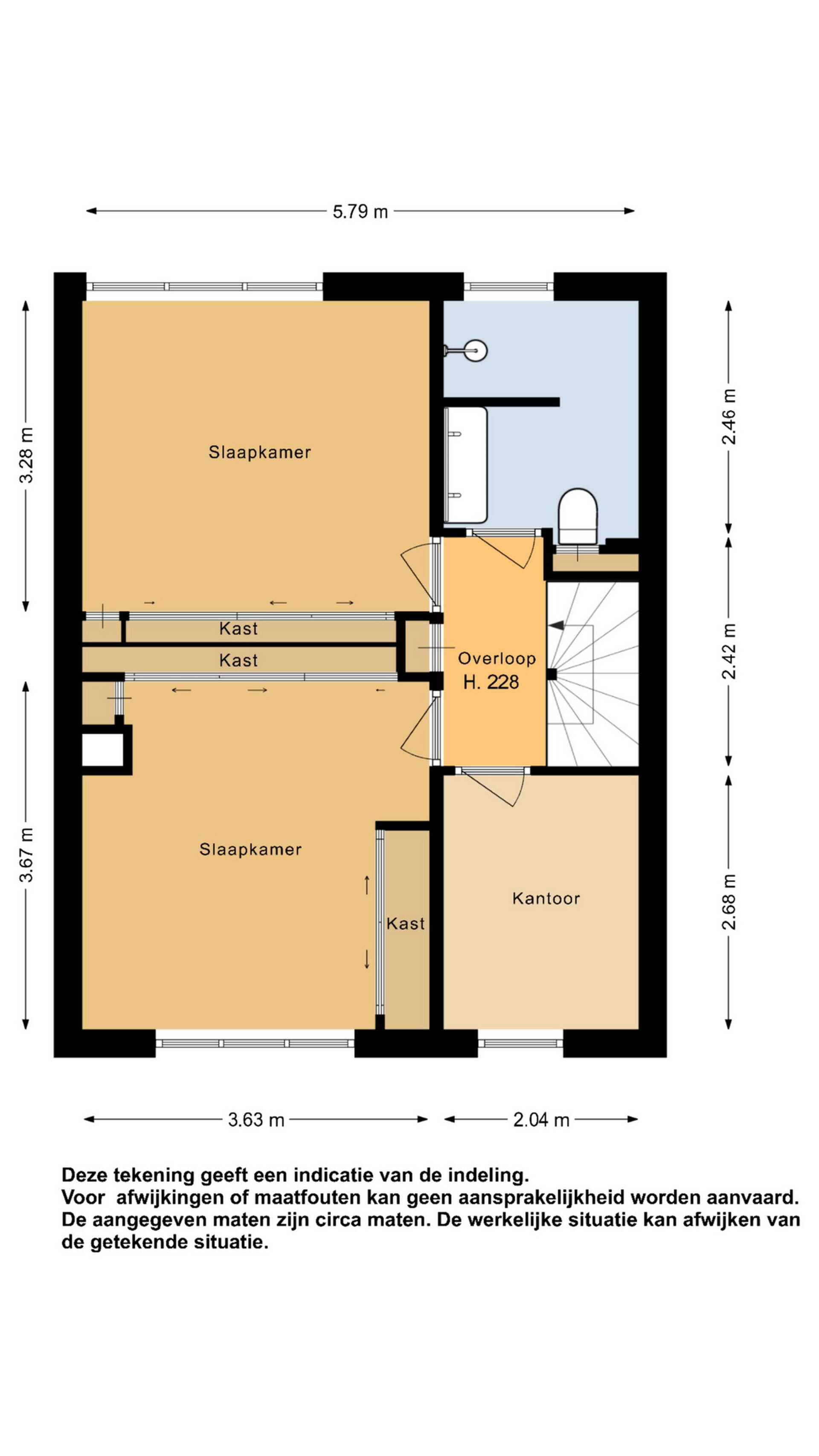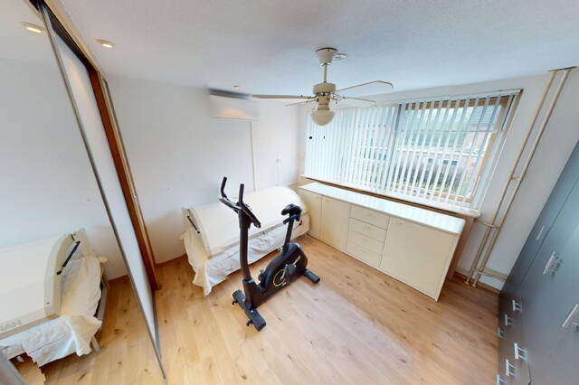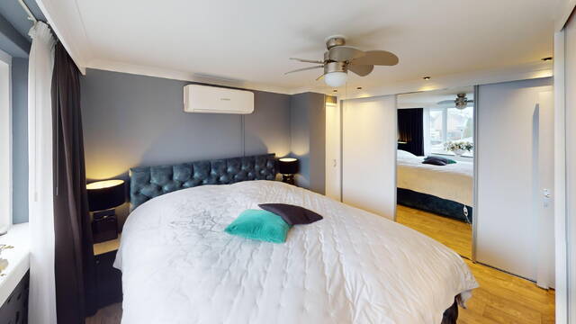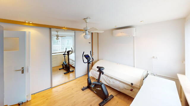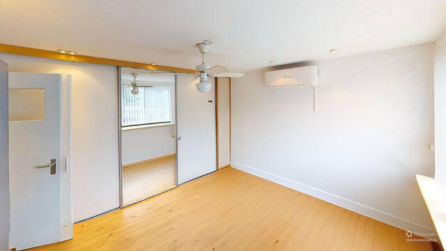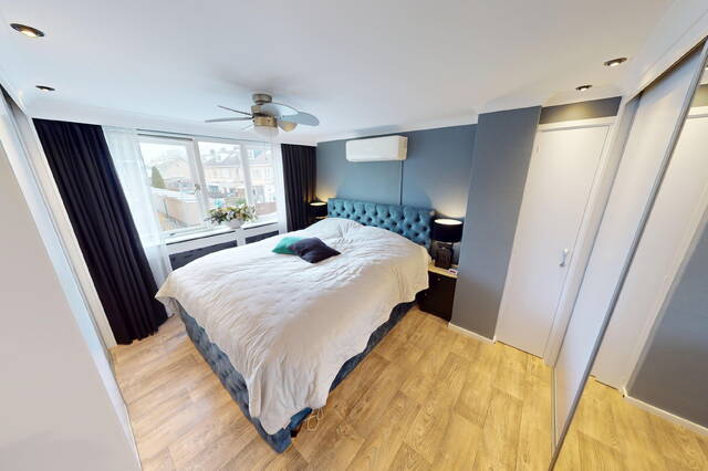 1e verdieping: op de 1e verdieping zijn naast de overloop en badkamer, een 3-tal slaapkamers van verschillende afmetingen gesitueerd. In 2 slaapkamers kunt u met gemak een 2-persoonsbed plaatsen. In een tweetal slaapkamers is ook een vaste kastenwand aanwezig. Bovendien treft u in beide slaapkamers ook airconditioning aan. Geen slapeloze nachten dus meer tijdens een hittegolf! Door de vormgeving van de woning heeft u de beschikking over recht opgetrokken wanden en hierdoor is er ook op deze verdieping veel ruimte aanwezig. De gehele 1e verdieping is keurig netjes afgewerkt onder meer met laminaatvloeren.