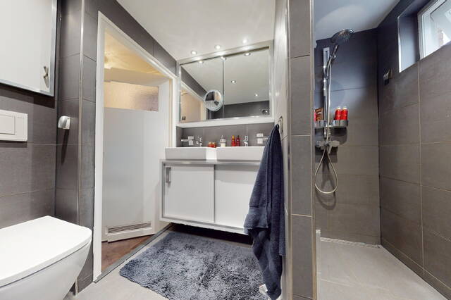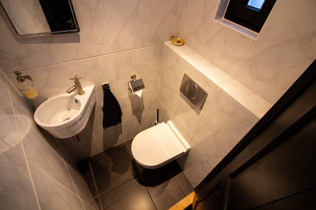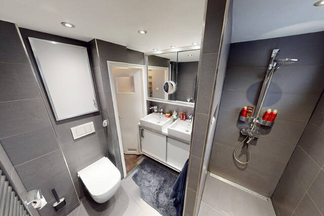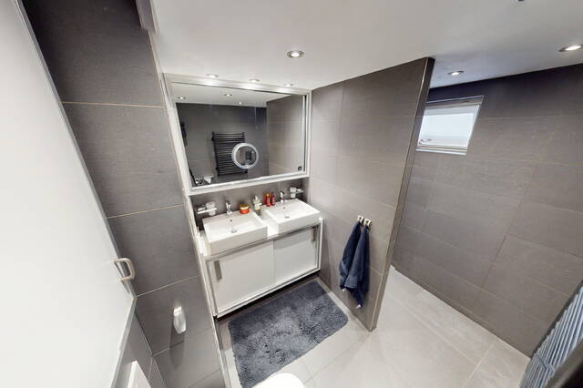 De luxe badkamer is in een moderne kleurstelling uitgevoerd en voorzien van een ruime inloopdouche met drain, wastafelmeubel met dubbele wastafels en een hangcloset.