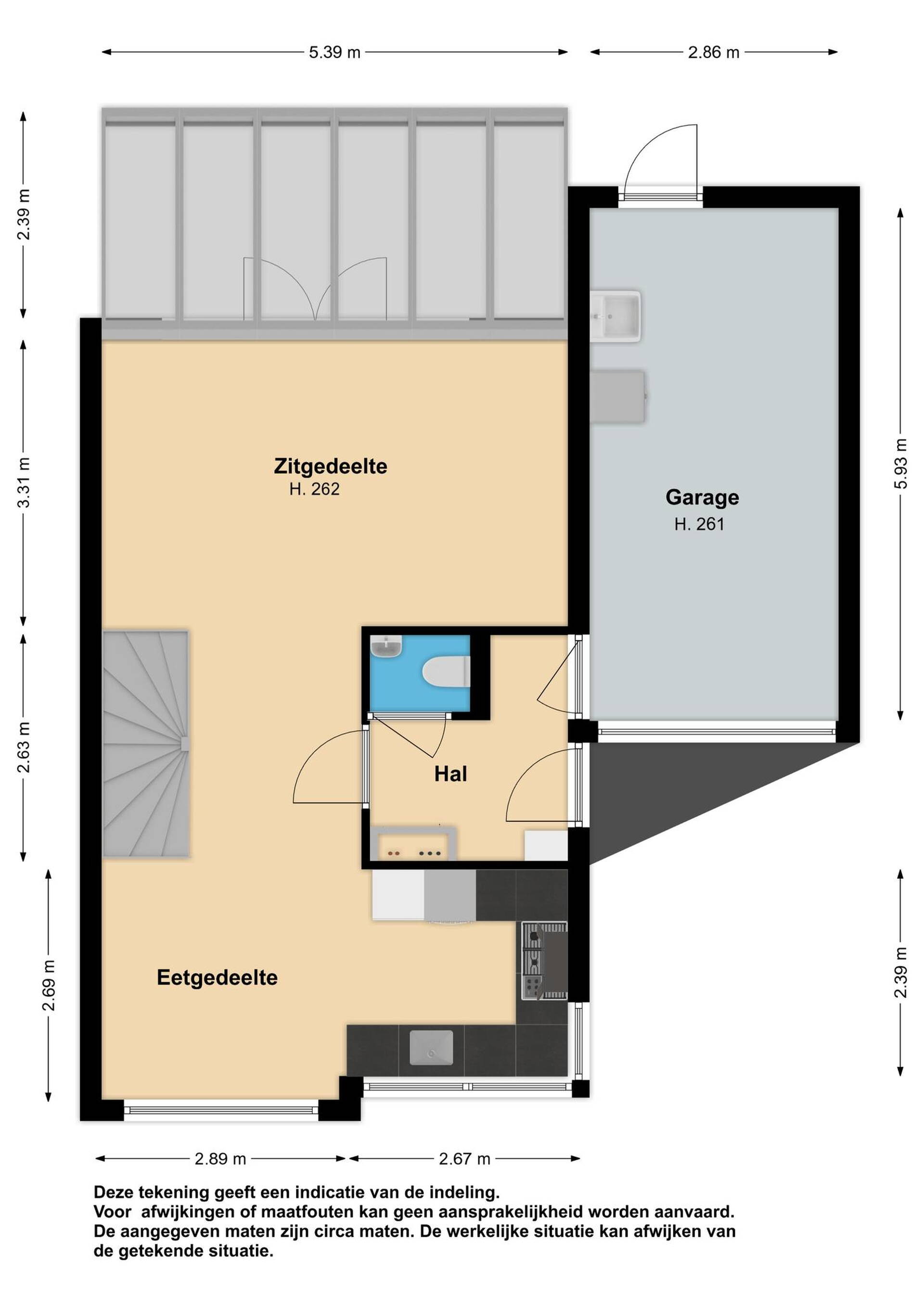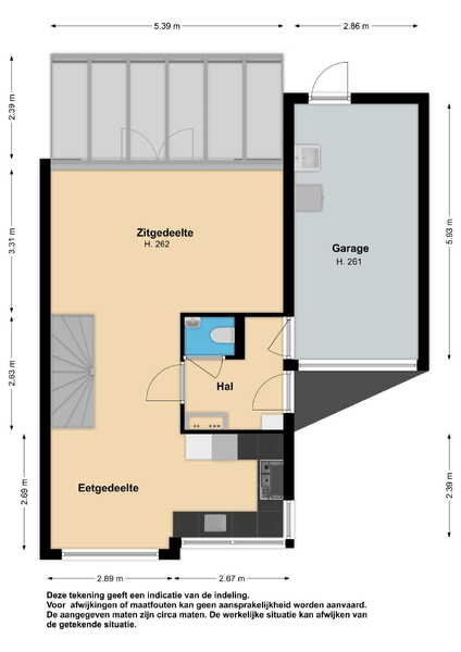 Begane grond: via de zijentree komt u in de hal met toegang tot de woonkamer en de garage. In de hal is naast de meterkast ook het toilet met hangcloset en fonteintje aanwezig.