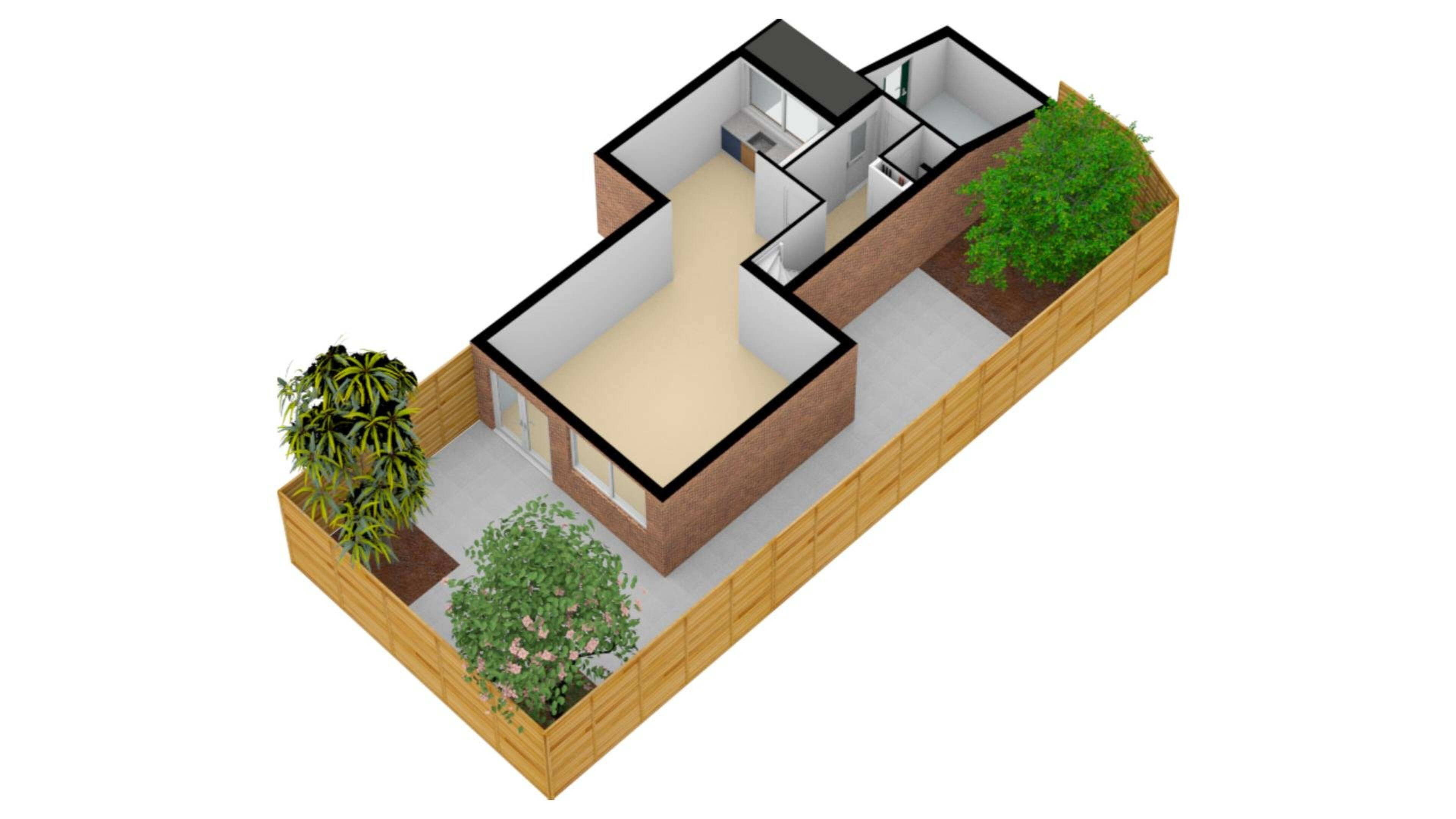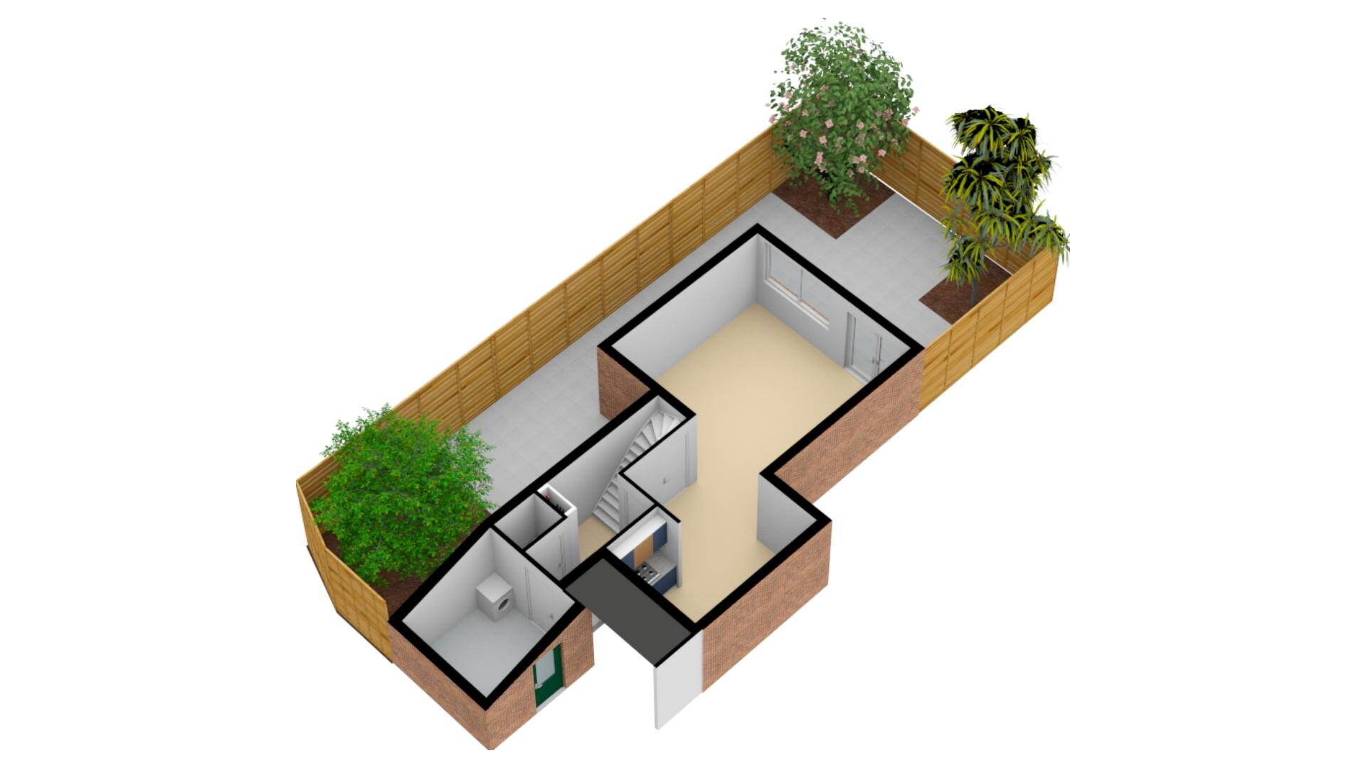 De speels ingerichte woonkamer heeft heerlijk zicht op de achtertuin. In de zonnige woonkamer bevindt zich een praktische trapkast, waar meer dan voldoende ruimte is voor uw voorraadartikelen en voor het plaatsen van de stofzuiger. Zo’n trapkast komt altijd van pas. Door de praktische vormgeving kunt u op diverse wijze uw meubels een plaatsje geven. Via de openslaande tuindeuren kunt u de achtergelegen tuin bereiken. De wanden zijn voorzien van behang en op de vloer treft u een laminaatvloer aan.
