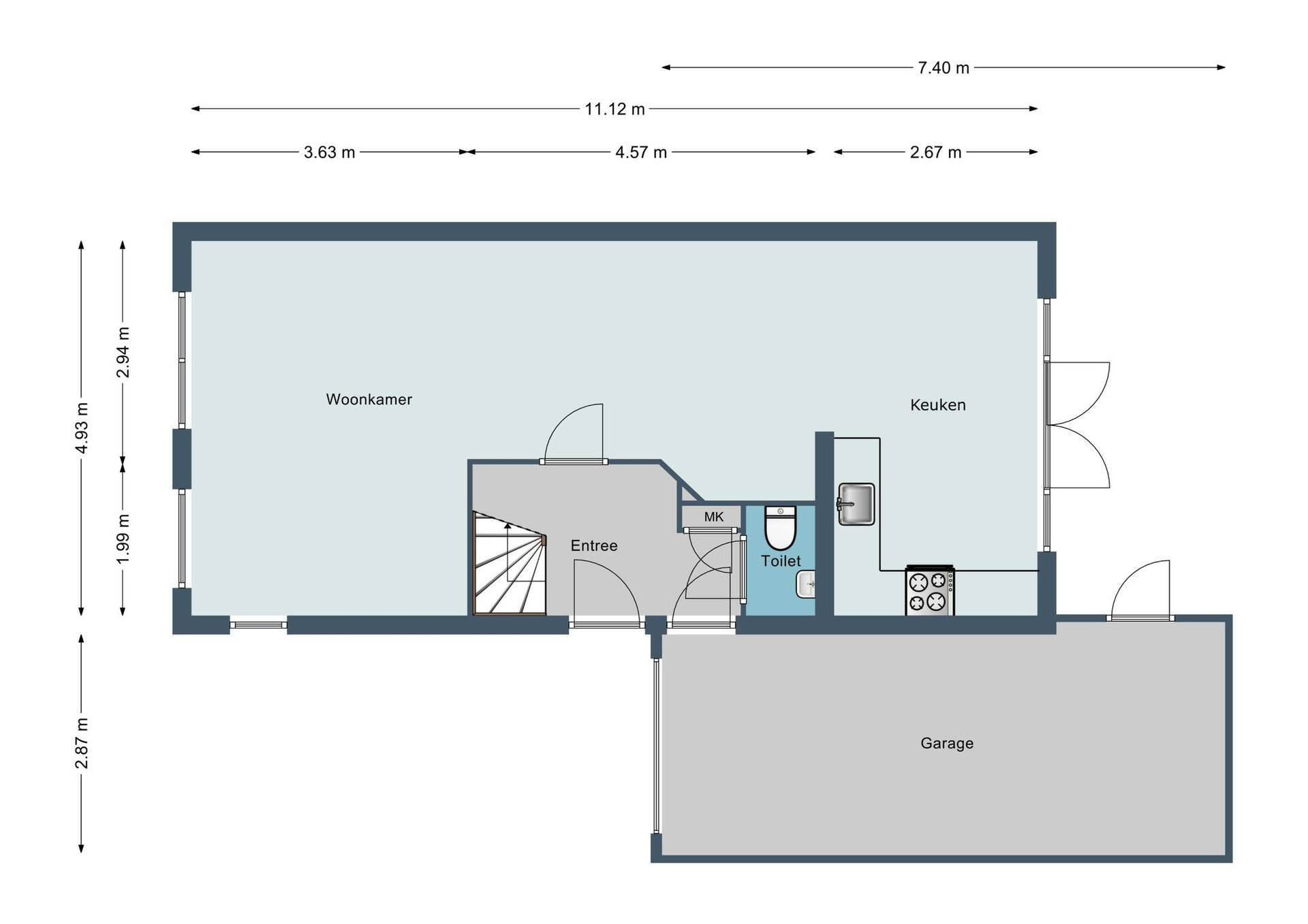 Via het oprij pad bereikt u de zij-entree en komt u in de ruime hal met garderobe, toilet, trapkast, meterkast, trapopgang naar de verdiepingen en binnendeur naar de garage.