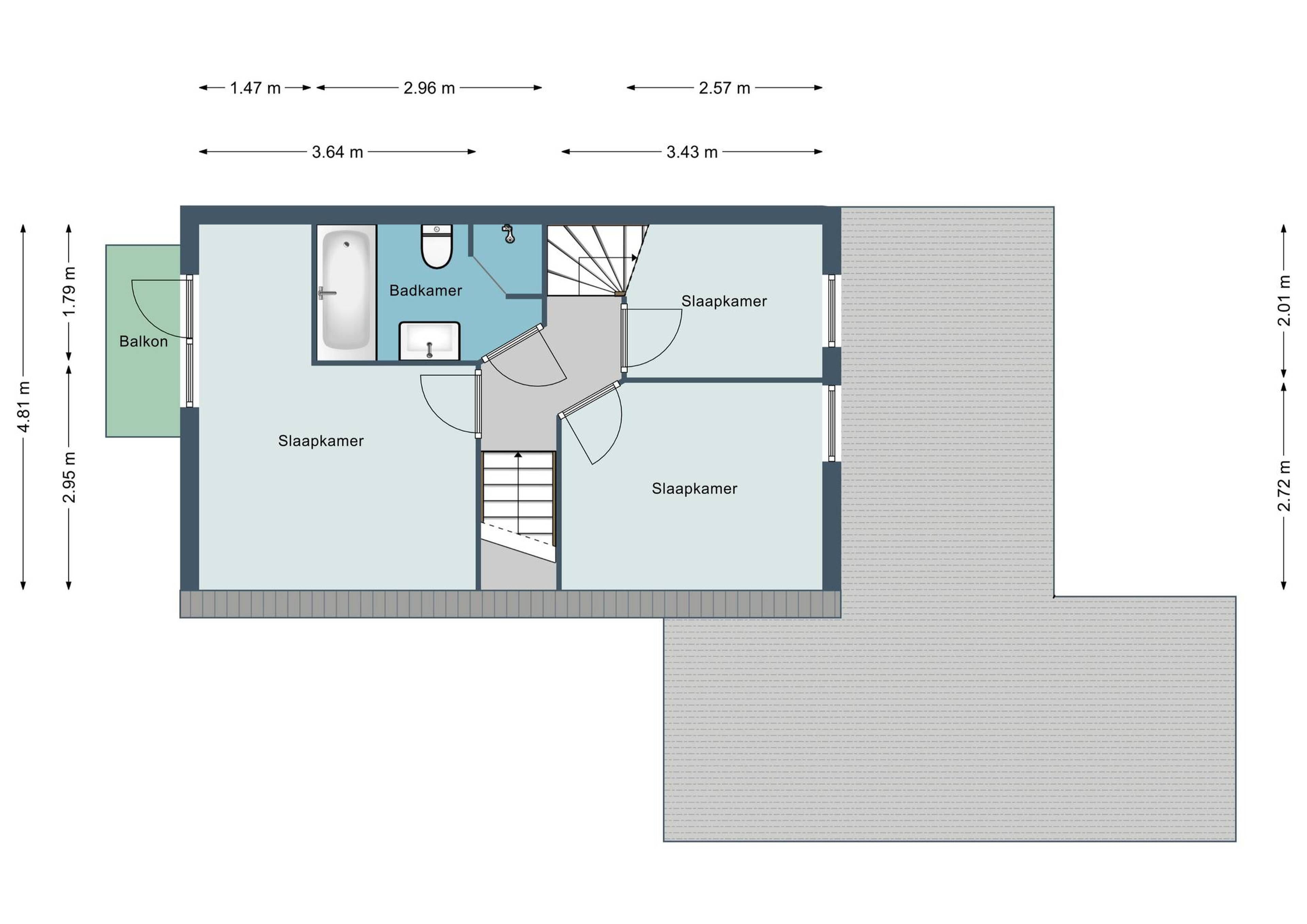 De kleinste slaapkamer aan de achterzijde van de woning is thans in gebruik als inloopkast. Zowel aan de voorzijde als de achterzijde van deze verdieping bevinden zich rolluiken.