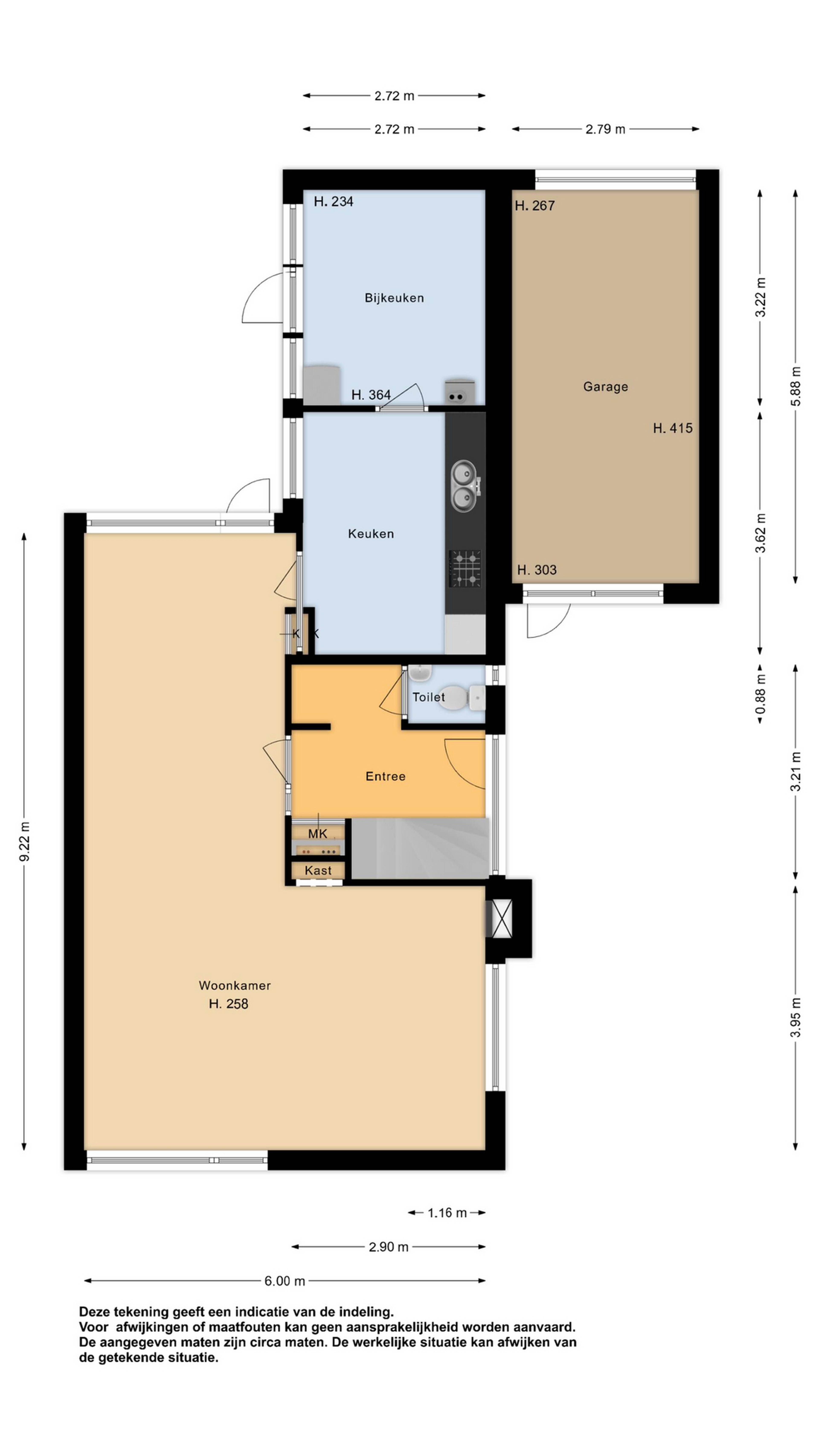 Begane grond: via de zijentree komt u in de hal van de woning. In de hal bevinden zich de meterkast en de functionele toiletruimte met closet en fonteintje. Daarnaast kunt u vanuit de hal de bovenliggende etage bereiken.