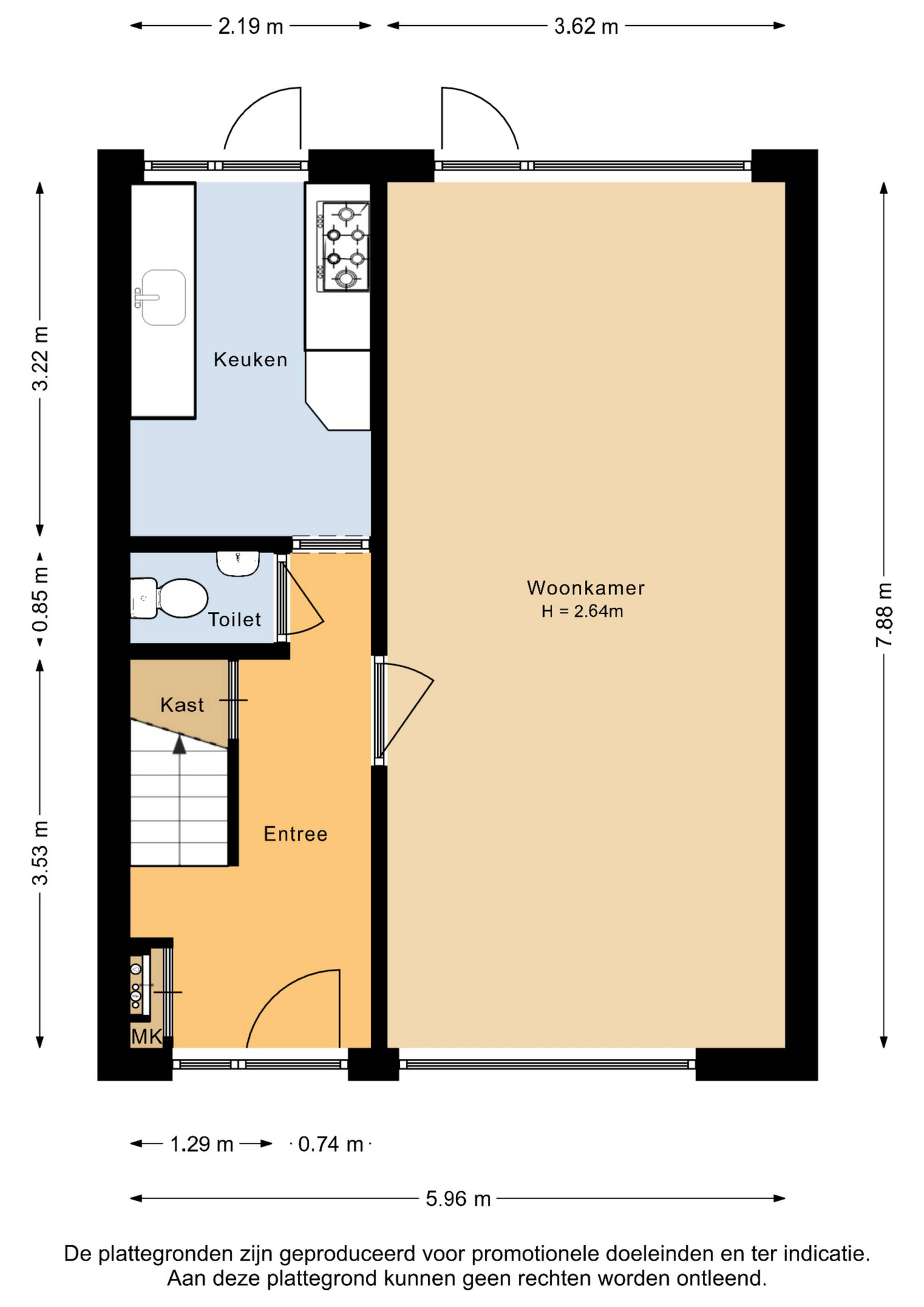 Als je binnenkomt via de voordeur kom je uit in de hal met de opgang naar boven, met daaronder de trapkast waar je de nodige spulletjes kunt opbergen, de toilet met fonteintje, de toegang tot de keuken en woonkamer.