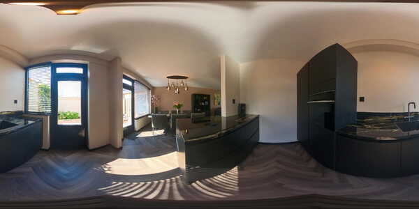 De nagenoeg nieuwe en moderne open keuken is uitgevoerd in zwart, met houtmotief op de deurtjes en voorzien van de meest moderne apparatuur, zoals een inductiekookplaat van het gerenommeerde merk Bora, die tevens voorzien is van een afzuigsysteem geïntegreerd in de kookplaat, zodat u geen lelijke afzuigkap meer nodig heeft. De kookplaat is gemonteerd in het naar de eetkamer gerichte kookeiland, zodat u tijdens het kokkerellen toch heerlijk verbonden blijft met uw gasten aan tafel. Uiteraard is deze moderne keuken ook voorzien van een koel-/vriesinstallatie, combioven, Quooker voor heet water en een vaatwasser.