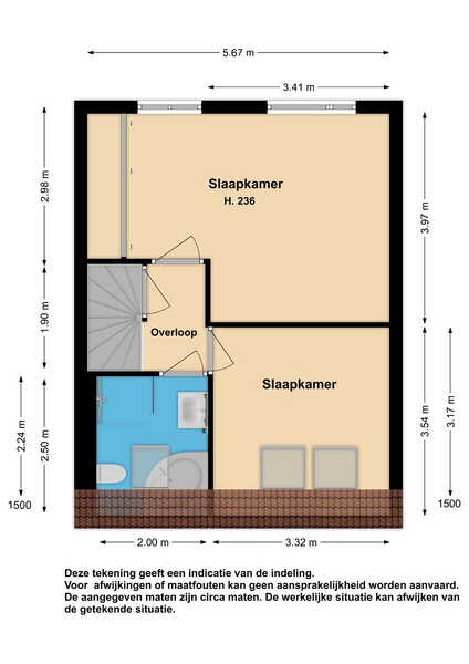 1e verdieping: op de 1e verdieping zijn 2 slaapkamers van verschillende afmetingen gesitueerd. De slaapkamers hebben nagenoeg recht opgetrokken wanden, zodat u de ruimte optimaal kunt benutten. In beide slaapkamers kunt u een 2-persoonsbed kwijt. Alle slaapkamers zijn voorzien van een keurige laminaatvloer. De slaapkamer aan de achterzijde is over de volle breedte van de woning gesitueerd en voorzien van een vaste kastenwand. Deze slaapkamer is eenvoudig weer terug te brengen naar 2 slaapkamers, zodat er 3 slaapkamers op deze verdieping aanwezig zijn.