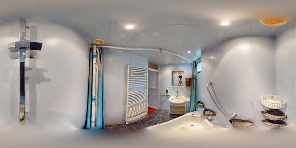 De functionele badkamer is volledig voorzien van kunststof panelen. Op de vloer treft u een plavuizenvloer aan. In de badkamer heeft u een halfrond hoekligbad met douchegelegenheid en een wastafel met meubel ter beschikking. Ook ontbreekt de design-radiator niet.