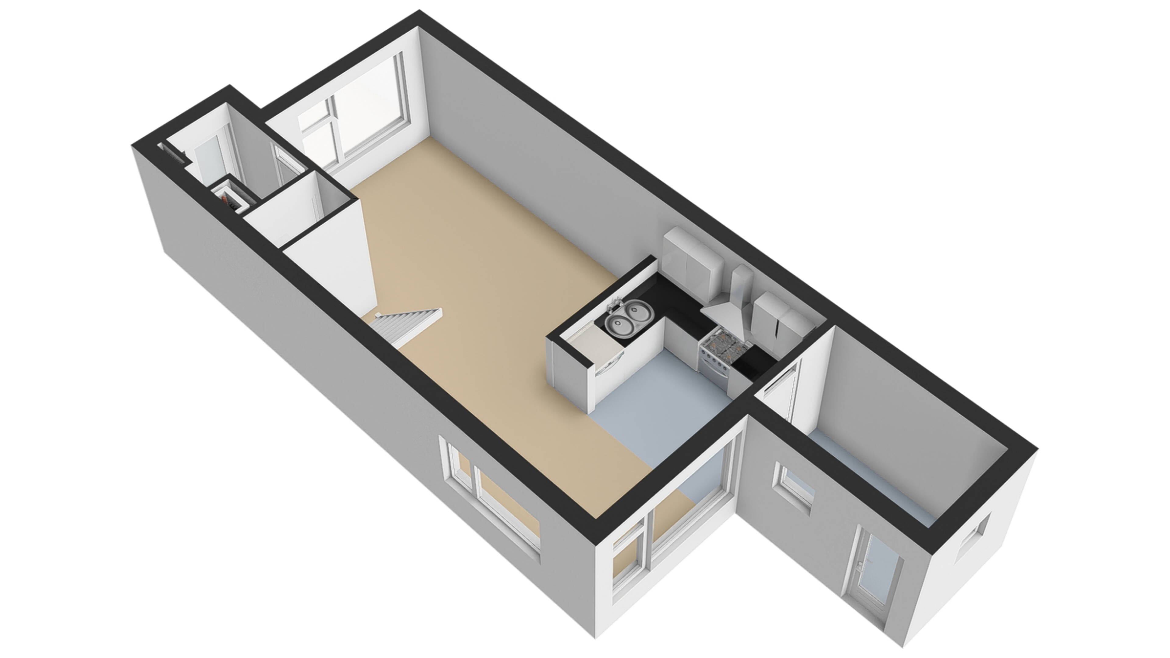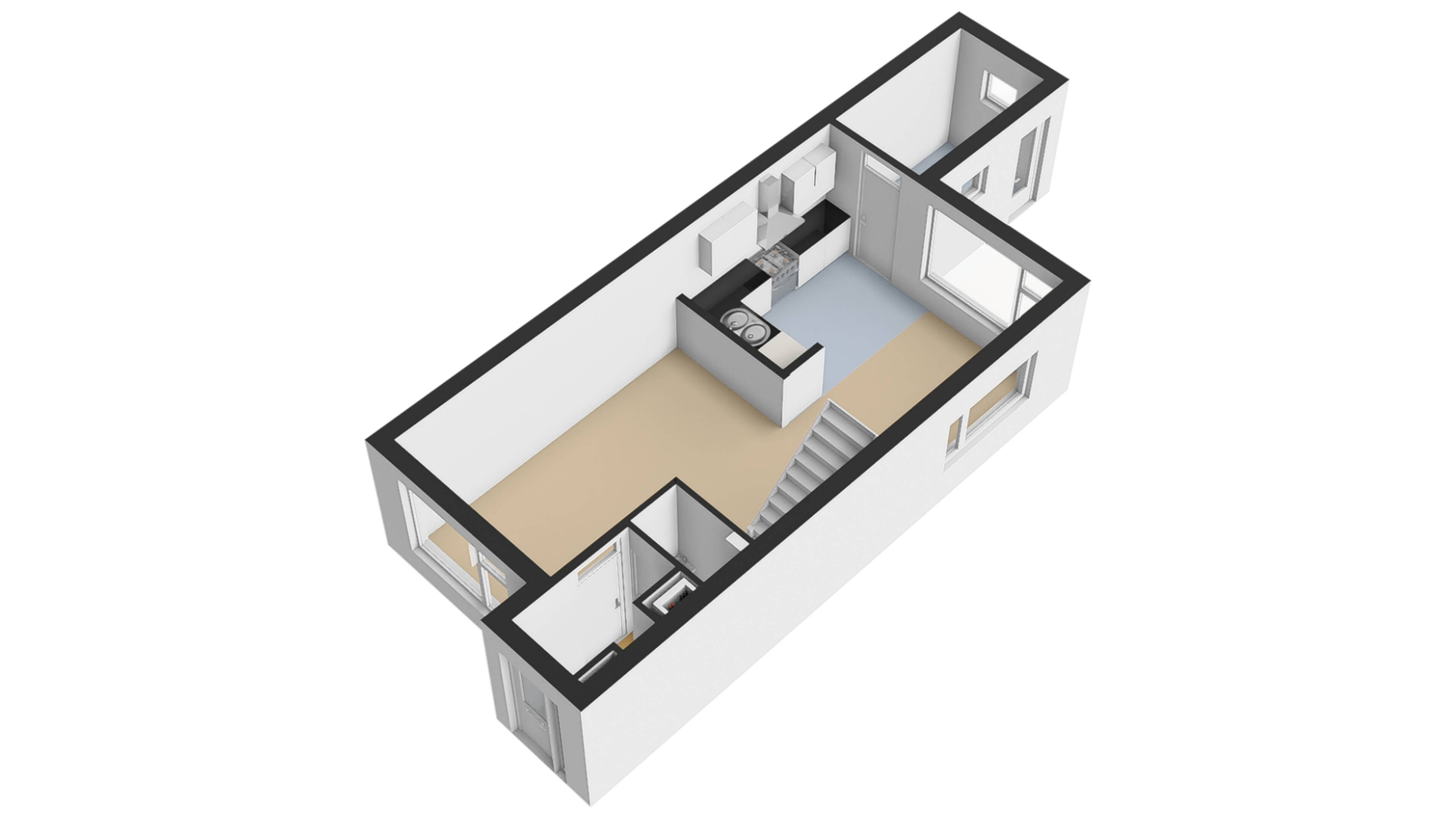De functionele open keuken in hoekopstelling is gelegen aan de achterzijde van de woning en verbonden met de woonkamer. U kunt hier eenvoudig een woon/leefkeuken creëren. De keuken is voorzien van afzuigkap, 4 pits gaskooktoestel met oven en vaatwasser.