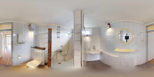 De functionele badkamer is volledig betegeld en voorzien van een douchegelegenheid, hangcloset en wastafel.