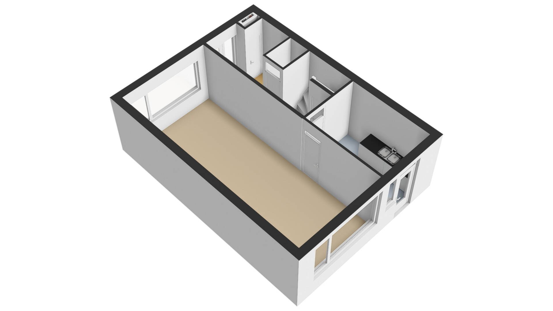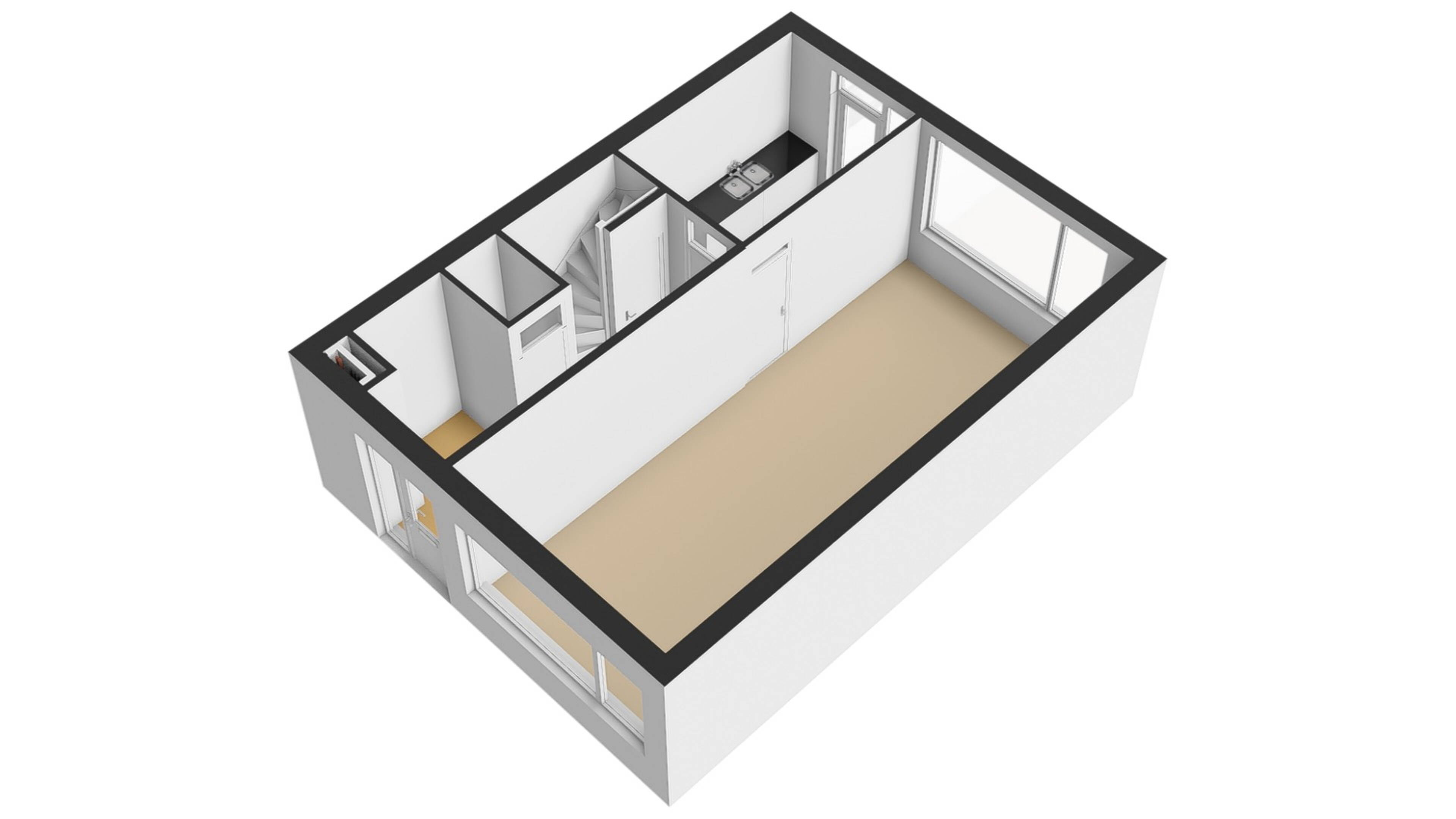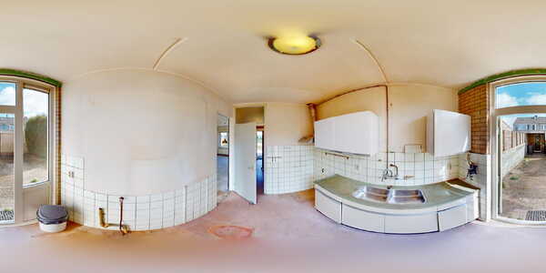 Vanuit de hal kunt u de functionele keuken bereiken. De keuken is in een rechte opstelling uitgevoerd. U heeft hier de mogelijkheid om een keuken aan beide zijden van de ruimte te plaatsen. Via de openslaande tuindeur kunt u de achtertuin bereiken.