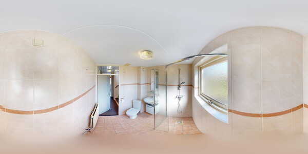 De keurige badkamer is volledig betegeld in een zalm kleurstelling en is voorzien van een inloopdouche, wastafel met meubel en een 2e closet. Deze ruime badkamer ziet er verzorgd uit.