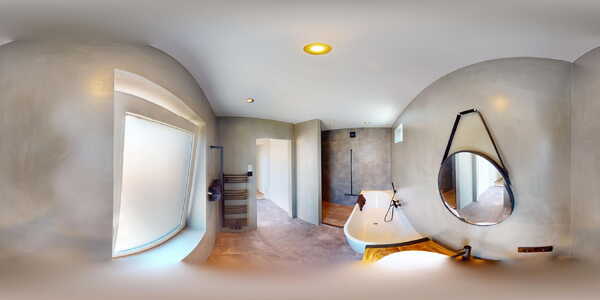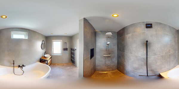 Badkamer: de ruime luxe badkamer is een fijne relaxruimte! Deze fraaie badkamer is uitgevoerd met een kunststof ligbad, inloopdouche met regendouche en wastafelmeubel. Uiteraard is de badkamer voorzien van een design-radiator. Het douchegedeelte is fraai afgewerkt met grote wandtegels. De overige wanden zijn voorzien van een betonlook.