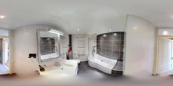 De luxe badkamer is een fijne relaxruimte. De volledig betegelde badkamer in moderne kleurstelling is namelijk voorzien van een fraai vormgegeven kunststof whirlpool met douchegelegenheid, wastafelmeubel, hangcloset en designradiator. De vloer is voorzien van plavuizen in een mokka kleurstelling. Het verlaagde plafond met inbouwspots maakt het geheel helemaal af!