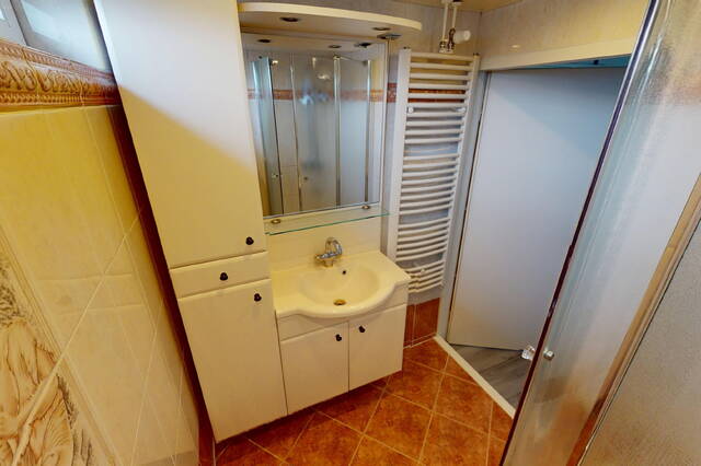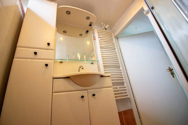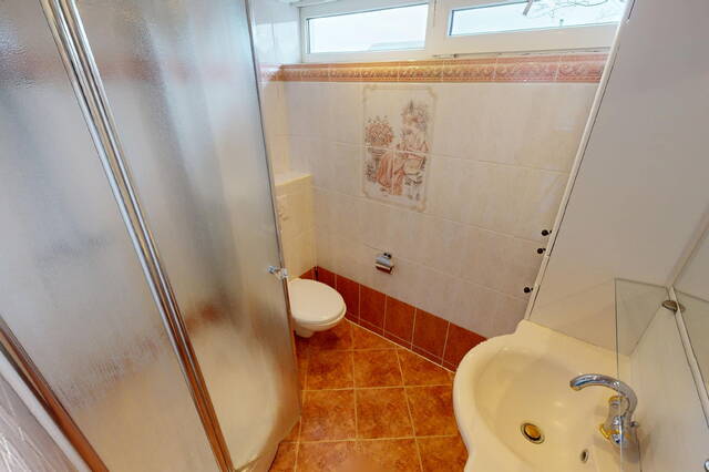De volledig betegelde badkamer is in een romantische kleurstelling uitgevoerd. Op de vloer treft u een plavuizenvloer aan. In de badkamer heeft u een douchecabine met regendouche, een wastafelmeubel met veel opbergruimte en een hangcloset tot uw beschikking. Uiteraard ontbreekt de design-radiator hier ook niet. Het geheel ziet er keurig uit.