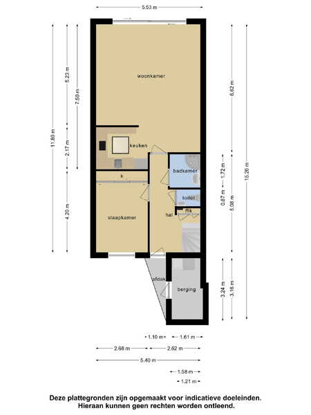 U komt binnen via de entree met meterkast, toiletruimte, trapopgang naar de verdieping en toegang tot de slaapkamer, de badkamer en de woonkamer.