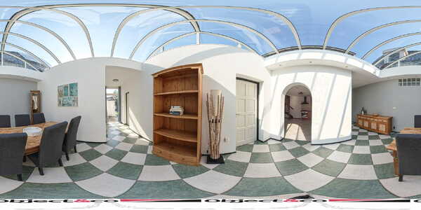 Als we via de aparte zij-ingang het achterste deel van de woning binnengaan, komen we in de eerste instantie uit bij wat vroeger de garage was. Deze ruimte kunt u beschouwen als bijkeuken of aparte wasruimte waar u uw wasmachine en droger ook zou kunnen plaatsen omdat ook hier een aansluiting voor aanwezig is. Deze ruimte heeft ook de ideale afmetingen om dienst te doen als separate kantoorruimte of sportkamer. We vervolgen onze weg richting de 2e woonkamer, maar niet zonder even stil te staan bij dit prachtige grote atrium van maar liefst 17m2. Ziet u zichzelf hier al zitten op een late zomeravond, kijkend naar de vallende sterren met een goed glas wijn in de hand? Of juist met het vroege ochtendzonnetje en een heerlijk kopje koffie aan de keukentafel op uw gemak de krant lezen. Zodra u zich in deze ruimte bevind voelt u zich alsof u in een vakantievilla aan de middellandse zee bent, dit komt mede door de lichtinval, de diagonaal gelegen plavuizen met speelse kleuren en de muren met karakteristieke bogen die veel in Mediterraanse dorpjes voorkomen.