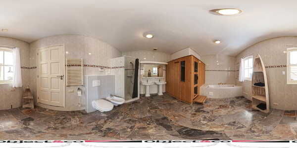 Links bevind zich de 2e badkamer die wel wat weg heeft van uw eigen privé wellness en voorzien is van een groot bad, een luxe en royale Finse sauna die groot genoeg is voor 4 volwassen personen, een vrij hangend wandcloset, een bidet, 2 wastafels met een zeer grote spiegel en een douche waar 2 thermostaat kranen u afwisselend van de nodige koud en warmwaterstralen kunnen voorzien nadat u volkomen ontspannen de sauna uitkomt.