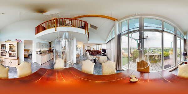Licht en zonnig, dat is het 1e gevoel dat u zult krijgen wanneer u de woonkamer binnenkomt. Door de raampartijen over de volle breedte van de woning heeft u altijd de zon in huis staan. Hier heeft u geen opgesloten gevoel, maar juist door het fraaie uitzicht een zeer, zeer ruimtelijke beleving! Dat wordt ook nog eens extra versterkt door het hoge plafond en vide! Dat is één van de voordelen van dit penthouse! In de gehele woning is een fraaie hardstenen vloer gelegd met comfortabele vloerverwarming. De kleurstelling van de vloer is zeer goed te combineren met een modern, klassiek of koloniaal interieur. Ook zijn alle wanden voorzien van stucwerk en zijn de plafonds mooi met spuitwerk afgewerkt. Mede door de vormgeving van de living kunt u op diverse wijzen uw interieur inrichten. Vanuit de woonkamer heeft u diverse toegangsmogelijkheden naar het zonnige en riante terras.