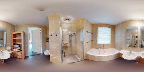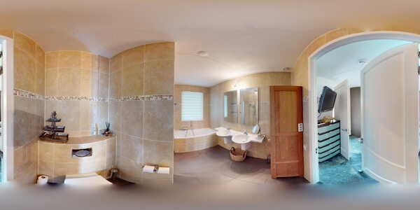 Slaapkamer en badkamer woonlevel: op het niveau van de living is de ruime hoofdslaapkamer gesitueerd. Via deze slaapkamer kunt u ook de luxe badkamer en het dakterras met sauna bereiken! In de volledig betegelde badkamer in mediterrane kleurstelling heeft u een kunststof ligbad, douchegelegenheid met drain, hangcloset en wastafelmeubel met dubbele wastafel tot uw beschikking. Het hoge afwerkingsniveau van de woning treft u zeer zeker ook in de masterbathroom aan!