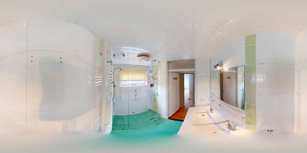 De functionele badkamer in lichte kleurstelling is volledig betegeld en uitgerust met een inloopdouche met dubbele douche, dubbele wastafel en een designradiator.