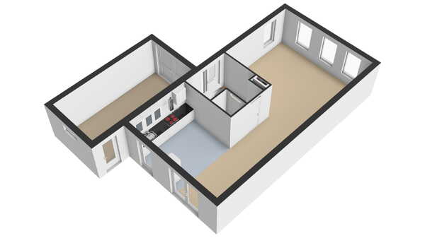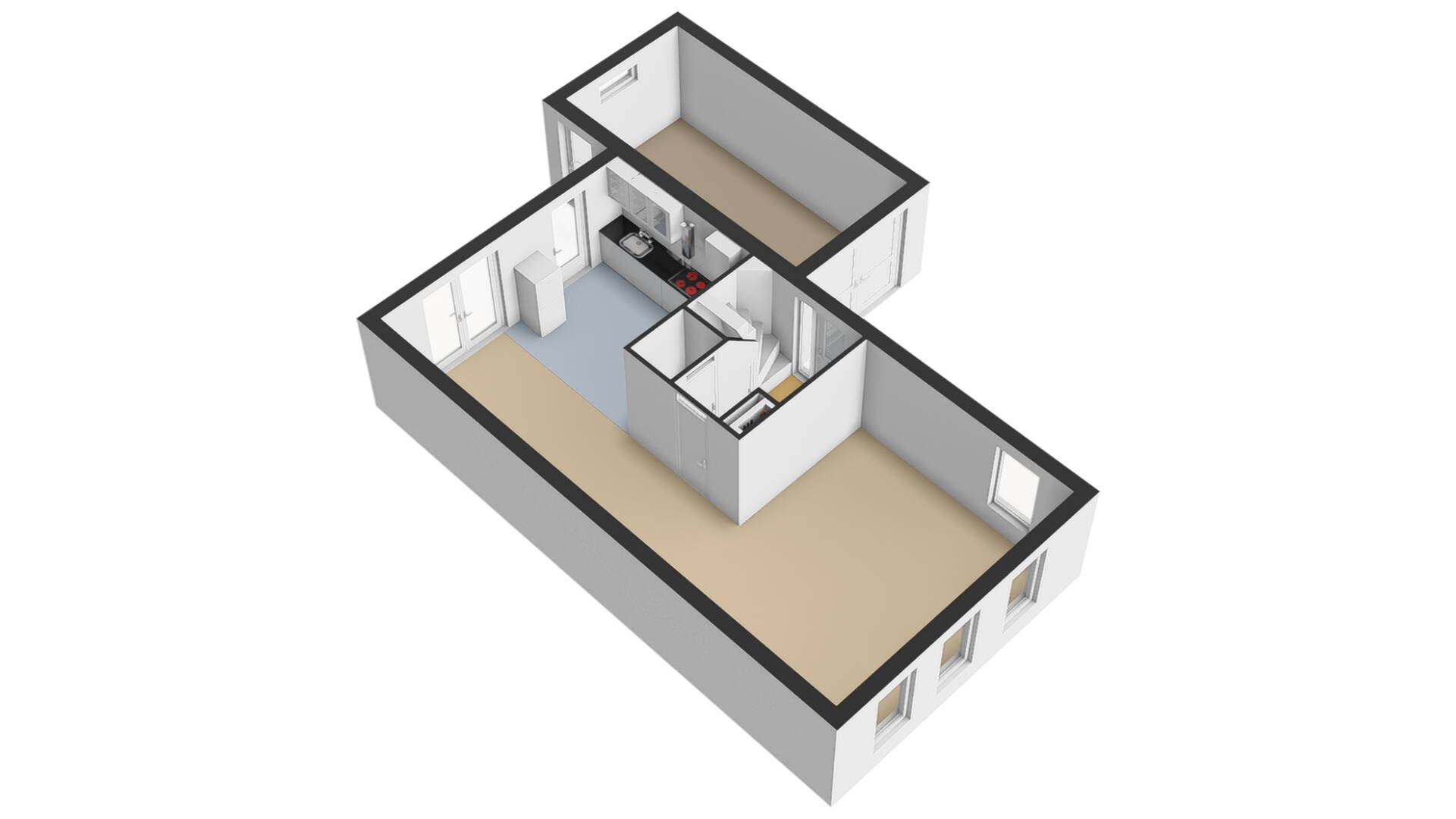 Vanuit het zitgedeelte heeft u geen direct zicht op uw aanrecht. Altijd fijn als u eerst heerlijk uw favoriete programma wilt bekijken. De keurige keuken in rechte opstelling is in een lichte kleurstelling uitgevoerd. Verder is de keuken voorzien van een 4 pits gaskookplaat, afzuigkap, hete luchtoven, vaatwasser en een losse koel/vriescombinatie. Vanuit de keuken heeft u eveneens, middels een loopdeur, toegang naar de achtergelegen tuin.