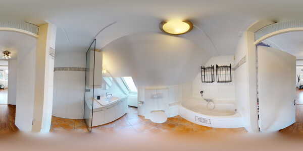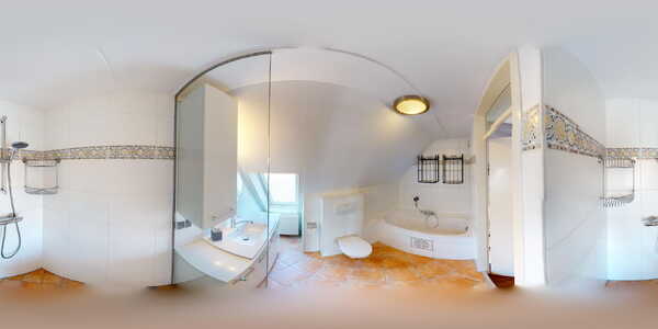 De volledig betegelde ruime badkamer in lichte kleurstelling is voorzien van een inloopdouche met scherm, groot wastafelmeubel, hangcloset en kunststof ligbad. Het is een heerlijke relaxruimte na een lange dag werken.